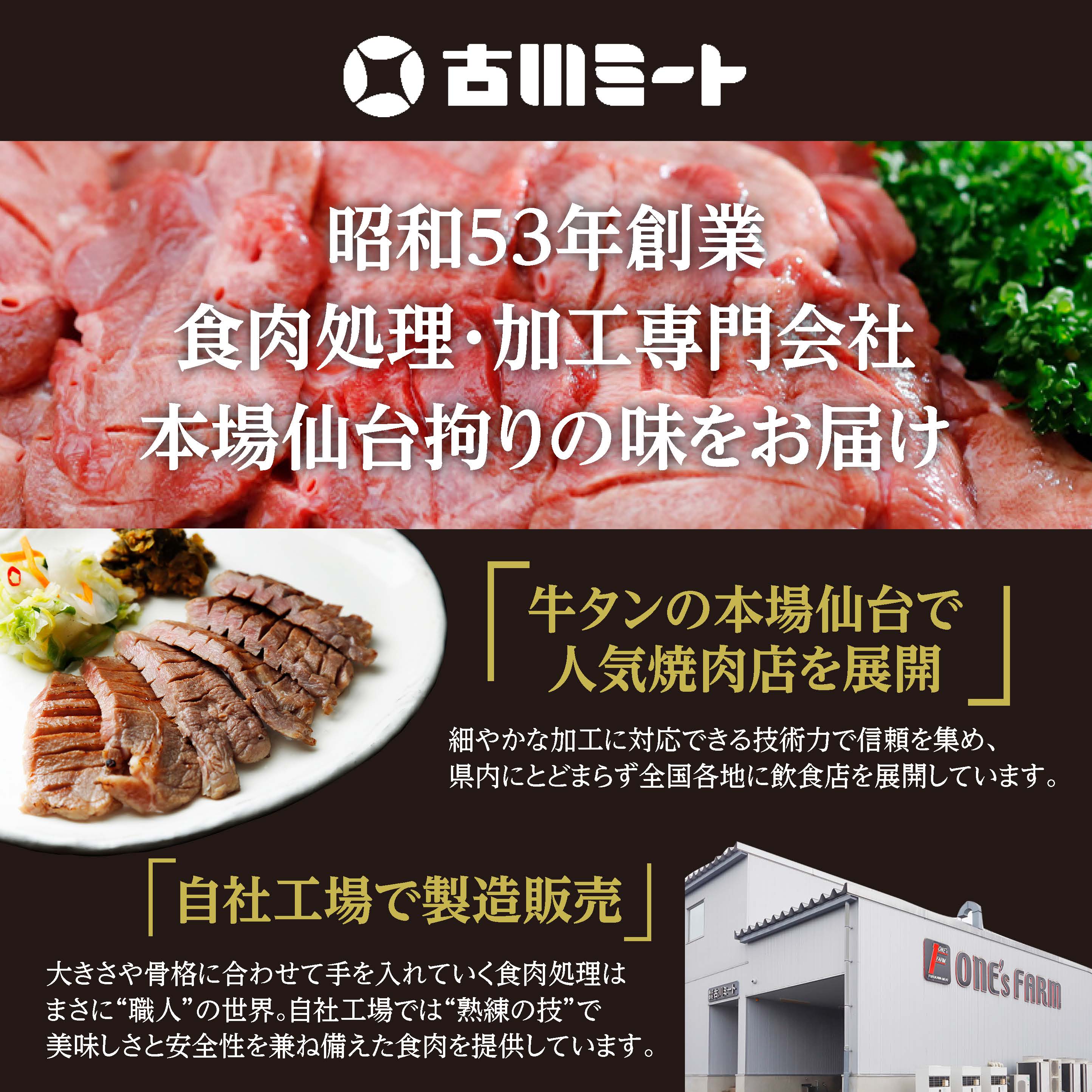 仙台名物として全国に知られた「牛タン」。厚切りの牛タンを「旨塩」でじっくりと仕込んだ定番の塩タン 商品説明名称厚切り牛タン塩800g(旨塩仕込み) 原材料名牛タン、食塩、かつお節エキス、昆布エキス/トレハロース、酸化防止剤(V.C、V.E)、甘味料(ソルビット)、pH調整剤(グルコン酸Na、重曹)、調味料(アミノ酸)、酵素、(一部に牛肉・大豆を含む) 原料原産地 オーストラリア、アイルランド、他内容量 厚切り牛タン旨塩仕込み 300g×1、500g×1 賞味期限出荷日を含め90日保存方法冷凍 製造者株式会社古川ミート 加工センター/宮城県大崎市古川江合本町3-3-2仙台名物として全国に知られた「牛タン」。厚切りの牛タンを「旨塩」でじっくりと仕込んだ定番の塩タン