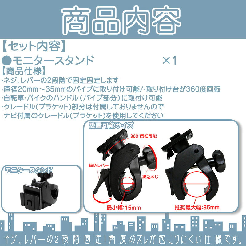 Shopping Guide お支払について 配送について 返品について メール便について あす楽について ※メール便につきましては、配送方法に指定されていない商品は対応不可となります。 ※あす楽につきましては、あす楽に指定されていない商品は対応不可となります。 適合リスト WNB~ WNB75ML YPB~ YPB274 YPB607si YPB618si YPB628si YPB707si YPB708si YPB717s YPB718P YPB718si YPB730 YPB731 YPB732 YPB733 YPB734 YPB735ML YPB736 YPB737 YPB740 YPB741 YPB742 YPB743 YPB744 YPB745ML YPB746 YPB747 YPB752 YPB753 YPF~ YPF7300 YPF757si YPF768si YPF778si YPF780 YPF781 YPF782 YPF857si YPF867si YPF868si YPF878si YPL603si YPF868si YPF878s YPL603si YPL721 YPL~ YPL603si YPL721 YPL722 YPL723 YPL724 YPL725ML YPL726ML YPL727ML 備考 ※表に記載の機種以外の適合につきましては当方では解り兼ねます。 適合リスト YPB〜 YPB7400-P YPB7410 YPB7420 YPF〜 YPF7500-P YPF7510 YPF7520 YPF7530 YPF7540 YPF7550ML その他 YuruTeru 備考 ※表に記載の機種以外の適合につきましては当方では解り兼ねます。 商品説明 ■モニタースタンド ユピテル(YUPITERU)のイエラ(YERA)・MOGGY・drivenavi対応の自転車・バイクのハンドルに取付可能なモニタースタンドです。 ■ハンドル取付タイプ 自転車・バイクのハンドル(パイプ部分)に取付を行うモニタースタンドとなります。 ■ダブルロック固定式 ネジ、レバーの2段階で固定を行うため、角度のズレが起きづらくなっております。 また、取付台は360度可能なため、気に入った角度にセッティング出来ます。 ■以下商品の代用品となります。 モニタースタンド(OP-CU80、OP-CU85、OP-CU95) 取付可能なハンドル(パイプ) ・直径が20〜35mmのパイプ ※真円のパイプであること。(楕円は、不可) ※ストラップ等による落下防止対策を必ず行ってください。 ※振動によって緩む場合がありますので、使用毎に固定部の締付け具合を確認して下さい。 商品内容 ・スタンド本体× 1 注意事項 ※必ずサイズ・形状・適合等をご確認の上、ご購入ください。 ※使用済商品の返品・返金、取付け時に掛かる費用のご請求等はお受け致しません。 ※当店は、当商品が原因で発生した破損や事故等に関して、一切の責任を負いかねます。 ※商品仕様については、予告なく変更される場合がございます。予めご了承ください。 ※当店は、取り付けサポートは、行っておりません。