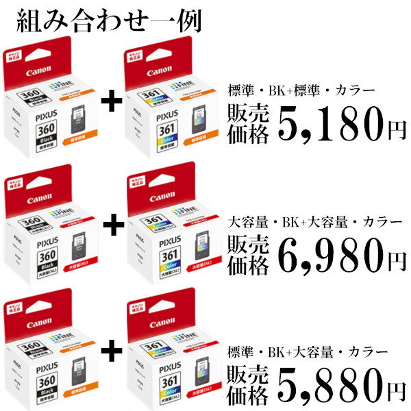 【商品説明】 CANONの純正インク360/361番 必要な色を組み合わせて、2色お選びください。 対象商品 BC-360(通常・BK) JAN:4549292144567 BC-361(通常・カラー)JAN:4549292144949 BC-360XL(大容量・BK) JAN:4549292144529 BC-361XL(大容量・カラー) JAN:4549292144932 【注意事項】 組み合わせによって販売価格が変わります。 選択後に表示される販売金額をご確認いただき、ご注文をお願いいたします。 【商品仕様】 商品名 選べる2色 CANON純正インク 360/361 商品状態 未使用新品