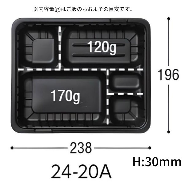 電子レンジ対応 入数 800枚 サイズ 本体:238×196×30mm フタ:高さ:20mm材質 本体:CT(電子レンジ対応) フタ:OPS(電子レンジ不可) ■弁当容器の材質について■CT・・・ポリプロピレン+タルク 電子レンジ対応 ポリプロピレンとタルクを配合した素材です。優れた耐油性と耐熱性により電子レンジの使用が可能です。耐熱温度/130℃OPS・・・二軸延伸ポリスチレン電子レンジ不可ポリスチレンの欠点である脆さを改善するために、縦横両方向に数倍の延伸処理をした素材です。優れた透明度の特性を生かし蓋の素材として主に利用されています。実使用温度/+80~-5℃ ガチ弁シリーズまとめ買いがお得♪ 大サイズ IK24-20E2 本体:238×196×30mm蓋:20mm ■ 100枚 ■ 800枚 送料無料 ■ 1600枚 送料無料 小サイズ IK23-17E2 本体:230×170×30mm蓋:20mm ■ 100枚 ■ 900枚 送料無料 ■ 1800枚 送料無料 大サイズ IK24-20C2 本体:238×196×30mm蓋:20mm ■ 100枚 ■ 800枚 送料無料 ■ 1600枚 送料無料 小サイズ IK23-17C2 本体:230×170×30mm蓋:20mm ■ 100枚 ■ 900枚 送料無料 ■ 1800枚 送料無料 大サイズ IK24-20A 本体:238×196×30mm蓋:20mm ■ 100枚 ■ 800枚 送料無料 ■ 1600枚 送料無料 z-253やz-256などの乗せ蓋タイプではなく、パチンと閉まる内嵌合蓋だから蓋が外れにくい♪ 輪ゴムいらずで効率アップ♪【特売】弁弁当容器 CTガチ弁 IK24-20A 黒 蓋付セット (800枚入) ●蓋が内嵌合(内側にはまり込む)なので外れにくく中身がこぼれにくいので、輪ゴム・テープ止めが不要です。 ●重ねても崩れにくい。本体底部と蓋表面の四隅にあるリブが噛み合い、重ねやすく荷崩れしにくくなっています。 ●上下どちらの方向からでもメニューのレイアウトを引き立てるトレーの仕切りにしました。 枚数別 ■100枚 ■800枚 送料無料 ■1600枚 送料無料