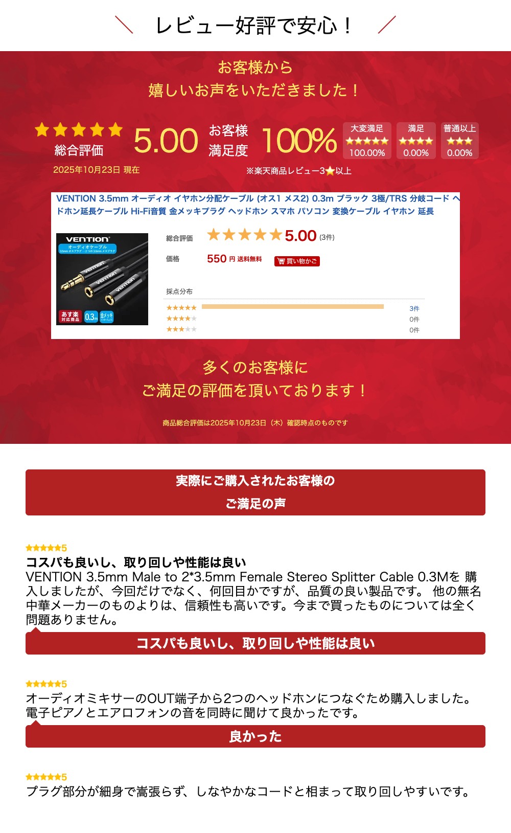関連商品VENTION 3.5mm Male to Male Audio Ca...VENTION 3.5mm to RCA赤白端子 オーディオ変換ケーブ...660円560円VENTION HDMIケーブル HDMI 1.4 HDMI 2.0規...VENTION HDMIケーブル 綿 編組み AAB Cotton B...550円627円VENTION 3.5mm オーディオ ケーブル TPE コットン編み...VENTION BAEBF 光ファイバー オーディオ ケーブル 1m ...671円616円VENTION ミニHDMIからHDMI 変換アダプタ mini HD...VENTION HDMIケーブル ウルトラハイスピード(1-5m認証)...550円840円VENTION Lanケーブル Cat.8 カテゴリー8 SSTP パ...VENTION 極薄 HDMIケーブル HD フラット 4K ハイスピ...550円550円関連ワード: オーディオケーブル 3.5mm オーディオケーブル イヤホン延長ケーブル イヤホン延長コード イヤホンジャック延長 3.5mm 変換ケーブル 3極 オス オス 音楽プレーヤー接続ケーブル 3.5mm 接続 3.5mm male to 2*3.5mm female stereo splitter cable ヘッドホン延長ケーブル スマホ パソコン ステレオスプリッター 0.3m ブラック 3極 TRS 分岐コード Hi-Fi音質 金メッキプラグ イヤホン イヤホン分配ケーブル イヤホン2人で商品名 【VENTION】3.5mm Male to 2*3.5mm Female Stereo Splitter Cable 0.3M ABS Type BBSBY ブランド詳細 VENTION(ベンション)は2011年に設立。 オーディオ器具などのネットワーク関連の周辺機器の製造、販売をするグローバル企業です。 ”VENTION”とは”Victory”(勝利)と”Invention"(発明)を意味し、ネットワーク周辺機器の更なる発展を目指しています。 商品詳細 ブランド:VENTION 商品名:3.5mm Male to 2×3.5mm Female Stereo Splitter Cable モデル:BBSB 色:ブラック インターフェース:3.5mmオス、3.5mmメス インターフェース技術:金メッキ コンダクター:エナメル銅 ジャケット:TPE AWG:29AWG OD:3.5mm 長さ:0.3m 保証:1年 パッケージ:PEバッグ 備考 【VENTIONの商品はこのようなアイテムやタイミングに使用できます】 液晶テレビ プラズマテレビ 液晶ディスプレイ DVDレコーダー ディスプレイパソコン ノートパソコン ゲーム ゲーム機 ブルーレイプレイヤー Blu-rayプレイヤー デジカメ デジタルビデオカメラ ビデオカメラ スマートフォン タブレット マルチモニター フルハイビジョン テレビ会議 リモート会議 大会議室 大会議 セミナー 音楽プレイヤー 【このような特徴があります】 3極 / TRS / イヤホン / 分岐コード / ヘッドホン延長ケーブル / Hi-Fi音質 / 金メッキプラグ / ヘッドホン / スマホ / パソコン / 変換ケーブル / 社内 / オフィス / デスクワーク / テレビゲーム / TVゲーム / パソコン / PC / ノートパソコン / デスクトップパソコン / 収納 / シンプル / 便利 / コード / ケーブル / テレワーク / 在宅 / リモート / 配線 / 拡張 / 延長 / モニター / テレビ / ゲーム / スマホ / リモートワーク / ガジェット / 在宅勤務 / ビジネス / オーディオ / 変換 / アダプター / アダプタ / 解像度 / ディスプレイ / デュアルディスプレイ / デュアルモニター / マルチディスプレイ / 同期 / 金メッキ / スタイリッシュ / オーディオスプリッターケーブル / オーディオ再生 / 2つのメスプラグ / 2つ同時 / 接続 / ABSシェル / 30cm 商品のお問い合わせをする 返品についての詳細を見る