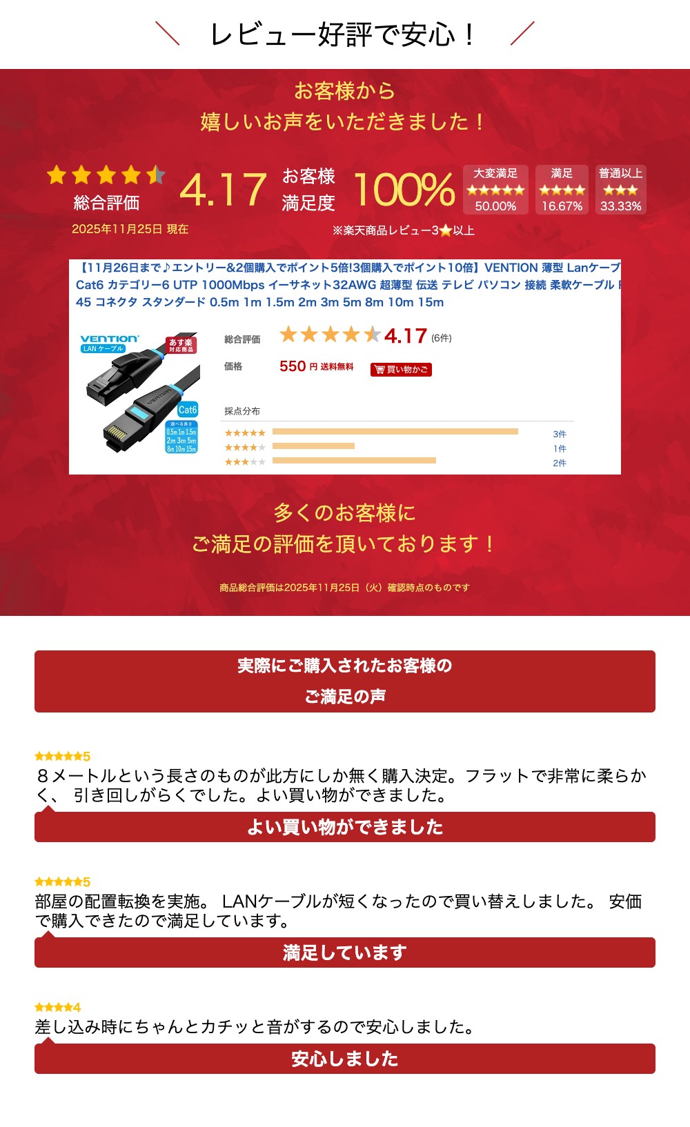 【11月26日まで♪エントリー&2個購入でポイント5倍!3個購入でポイント10倍】VENTION 薄型 Lanケーブル Cat6 カテゴリー6 UTP 1000Mbps イーサネット32AWG 超薄型 伝送 テレビ パソコン 接続 柔軟ケーブル RJ45 コネクタ スタンダード 0.5m 1m 1.5m 2m 3m 5m 8m 10m 15m