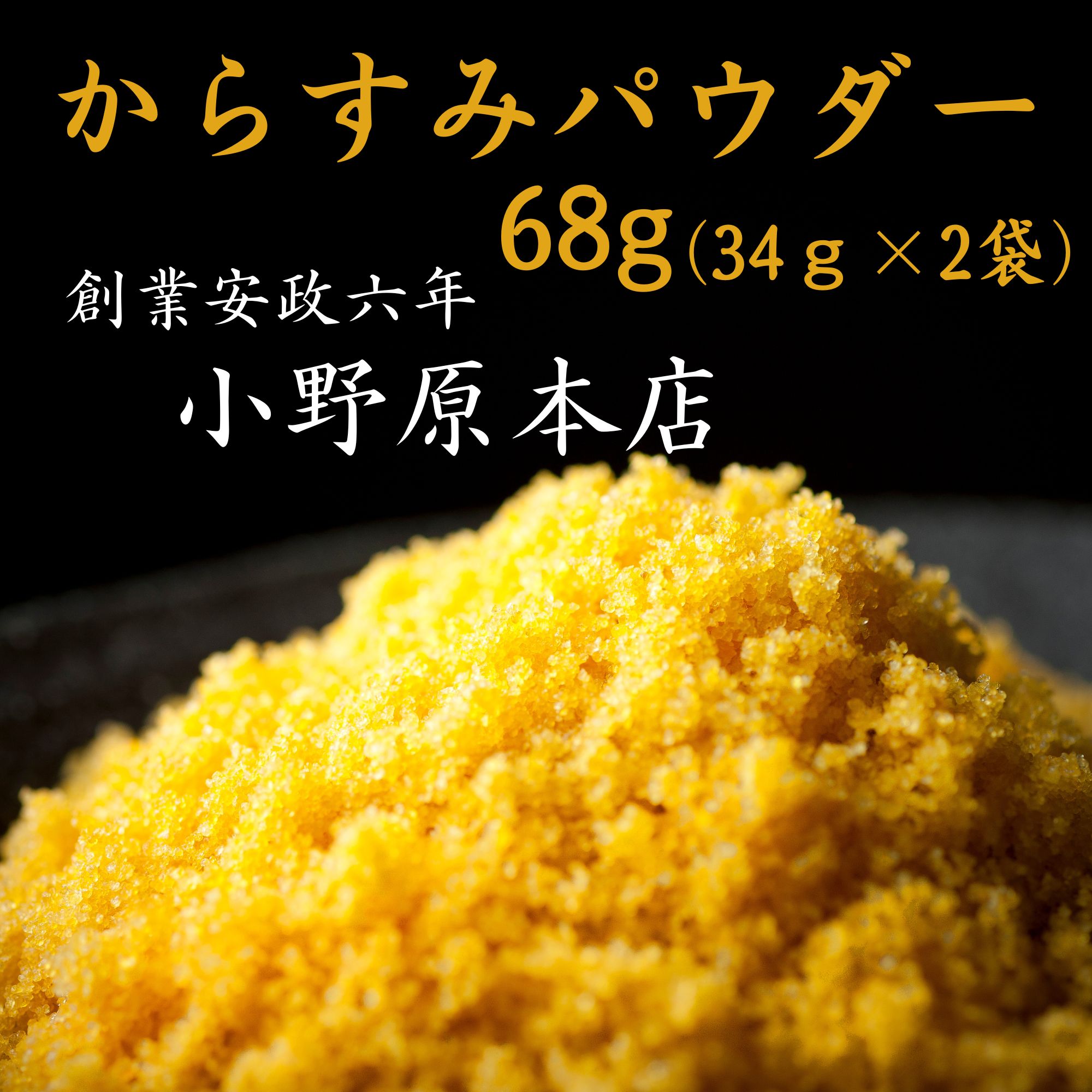 からすみパウダー 小野原本店 68g(34g×2袋) カラスミパウダー 長崎 そぼろ パスタオイル ソース 粉 調味料 お中元 贈答用 ギフト お歳暮 本からすみ カラスミ 唐墨 酒 肴 珍味 おつまみ 高級 通販 父の日 スライス 送料無料 老舗 日本三大珍味 ボッタルガ ムジーナ