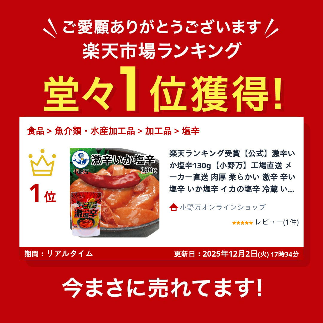 楽天ランキング受賞【公式】激辛いか塩辛130g【小野万】工場直送 メーカー直送 肉厚 柔らかい 激辛 辛い 塩辛 いか塩辛 イカの塩辛 冷蔵 いか 珍味 冷蔵 ご飯のお供 おかず 酒の肴 おつまみ 家飲み 気仙沼 宮城 三陸 げきからいかしおから おのまん