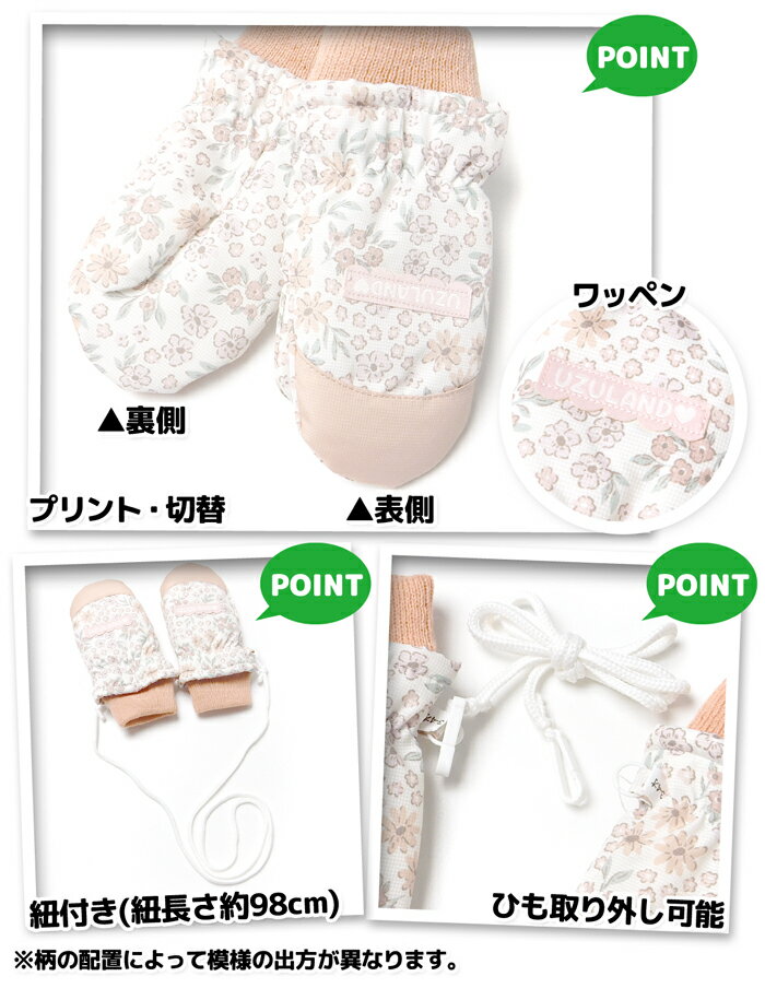 コメント 小花柄が可愛らしい女児ベビーミト ン手袋。ふわふわ裏ボア&フリース 仕様、保温性のある中綿入りで暖か ☆嬉しい紐付きで無くす心配があり ません♪ 特長 ・UZULAND(ウズランド) ・ミトン型中綿手袋 ・スノーグローブ ・裏フリース&ボア素材 ・防寒 ・暖かい/温かい ・保温性 ・ひも付き(取り外し可能)/ 長さ約98cm ・中綿入り ・プリント ・切替 ・ワッペン ・小花柄 ・スキー/雪遊び/外遊び/通園/ かわいい/可愛い/おしゃれ 素 材 ・(本体)ポリエステル100% ・(カフス部分)アクリル100% 対 象 ・ベビー用 ・子供用 ・女の子 サイズ /年齢/リブ含む長さ/幅/ 【1-2才】/16/7.5cm/ 【3-4才】/17/8cm/ 個体によっての若干の誤差はご了承ください。 商品番号 iw-1465_254836_4433【G01】