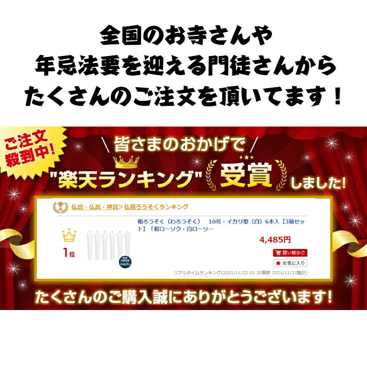 【品名】和ろうそく 10号・イカリ型(白)6本入×3箱セット 【寸法】 長さ約15.5cm×上径約2.9cm×下径約1.8cm 【燃焼目安時間】3時間20分 白の和ろうそくは、普段使い、不祝儀(葬儀)の時に使います。 石川県能登地方七尾市の伝統工芸品、七尾の和ろうそくです。 芯に和紙を用い、植物油を原料とする和ろうそくは、すすが出にくく お仏壇やお寺、お墓で使われてきました。 和ろうそくの命とも言える芯は、先まで空洞になっているため、 燃えている間も常に灯芯草から吸い上げたロウと酸素が供給され 風にも強い、しっかりとした炎になります。 また、その炎のゆらぎは見ている人に癒しの効果を与えてくれます。 石油を原料とする西洋のろうそくと比べ、天然の素材で製造されている和ろうそくは、地球環境にも人の心にも優しいろうそくです。 手作りですので1本1本形・仕上がり、風合いが違います。 ※和ロウソクは燃焼途中に芯切りを行う必要がございます。 和ろうそくは、火を灯していても芯が残るため、火がだんだん大きくなっていきます。 火が大きくなってきた時には、芯切り鋏で芯を切り火の大きさを調節します。 芯切り鋏もぜひ大越仏壇にてお買い求めくださいませ。 ※関連ワード※ 環境 SDGs 植物性 やさしい ゆらぎ 炎 癒し いやし 能登 七尾 伝統工芸 伝統 蝋燭 ろうそく ロウソク お寺 寺院 法要 法事 仏壇 墓 墓石 朱 白 燃焼時間 芯切り 和ろうそく 和ロウソク ろーそく ローソク 碇型 イカリ型 葬儀 葬式 心 こころ 地球 報恩講 彼岸 お盆 墓参り お参り 合掌 ろう和ろうそく(わろうそく) 10号・イカリ型(白)6本入【3箱セット】「和ローソク・白ローソク・白ろうそく・蝋燭・法要・葬儀」 石川県能登七尾の伝統工芸品。植物ロウを主原料とた地球にやさしいろうそくです。日常のお参りでも年忌法要でも使えるオールマイティーなサイズです。 大越仏壇の和ろうそくのこだわり石川県能登地方七尾市の伝統工芸品、七尾の和ろうそくです。芯に和紙を用い、植物油を原料とする和ろうそくは、すすが出にくくお仏壇やお寺、お墓で使われてきました。和ろうそくの命とも言える芯は、先まで空洞になっているため、燃えている間も常に灯芯草から吸い上げたロウと酸素が供給され風にも強い、しっかりとした炎になります。また、その炎のゆらぎは見ている人に癒しの効果を与えてくれます。石油を原料とする西洋のろうそくと比べ、天然の素材で製造されている和ろうそくは、地球環境にも人の心にも優しいろうそくです。手作りですので1本1本形・仕上がり、風合いが違います。和ろうそく使用時の注意点※和ロウソクは燃焼途中に芯切りを行う必要がございます。和ろうそくは、火を灯していても芯が残るため、火がだんだん大きくなっていきます。火が大きくなってきた時には、芯切り鋏で芯を切り火の大きさを調節します。芯切り鋏もぜひ大越仏壇にてお買い求めくださいませ。※関連ワード※環境 SDGs 植物性 やさしい ゆらぎ 炎 癒し いやし 能登 七尾 伝統工芸 伝統 蝋燭 ろうそく ロウソク お寺 寺院 法要 法事 仏壇 墓 墓石 朱 白 燃焼時間 芯切り 和ろうそく 和ロウソク ろーそく ローソク 碇型 イカリ型 葬儀 葬式 心 こころ 地球 報恩講 彼岸 お盆 墓参り お参り 合掌 ろう 報恩講 御正忌 8