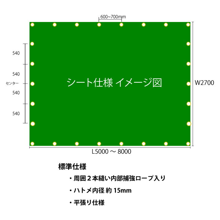 商品名トラックシート 5号帆布 7色 2tワイド 4t標準車 2150幅サイズ 国産ポリエステル帆布製サイズシート W2.7mxL5.0m~8.0mカラー全7色生地詳細厚み0.58mm ポリエステル帆布製 国産品対応車種メーカートヨタ スズキ ホンダ 三菱 マツダ ダイハツ 日産 いすず 日野 各社トラック用 汎用タイプ使用上注意※極端に重量の掛かる使い方はご遠慮ください。 シートの破れ、ハトメの飛びなどの原因になります。雨溜、積雪の際は特にご注意ください。 ※シートサイズご確認の上購入してください。注意事項※材料の性質上、多少の寸法誤差が生じる場合がございます。ご了承ください。 ※ゴムロープは別途ご用意ください。当店でも販売しております。※オプション ハトメ部補強布 3300円ハトメ部分に追加で生地を挟み込み補強します。 局部的な力の影響の破れ防止に効果あり。 ※四隅のハトメは含みません。※オプション 四隅三角補強 3300円シート四隅の二重補強加工になります。 引張に対する力に効果あります。 ハトメ部の補強にもなります。 関連商品はこちらトラックシート用ゴム リングタイプ ゴ...トラックシート用ゴム リングタイプ ゴ...トラックシート用ゴム ゴムバンド ゴム...トラックシート用ゴム リングタイプ ゴ...補修テープ コスモワッペン 切売り(1m...