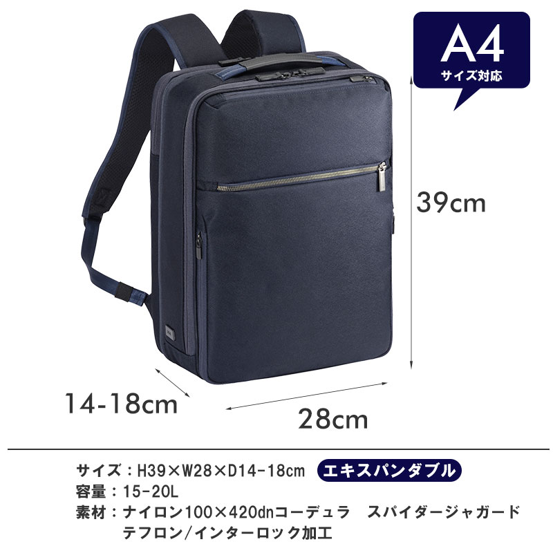 同シリーズ商品一覧はこちら ace.GENE商品一覧はこちら 関連キーワード ギフト プレゼント ラッピング 贈り物 贈答品 御祝 ブランド 記念日 誕生日 社会人 成人式 景品 記念品 オシャレ おしゃれ 人気 クリスマス バレンタイン ホワイトデー 父の日 母の日 新生活 ランキング 人気 御祝い お祝い 内祝い 入学 卒業 入園祝い 成人祝い 卒園祝い 就職祝い 進学祝い 新築祝い 結婚記念日 出産祝い 還暦祝い 昇進祝い 定年祝い 退職祝い 退職記念 歓迎会 送迎会 送別会 周年記念 記念品 ノベルティ 粗品 イベント 創立記念 設立記念 優勝 トロフィー 盾 楯 ホールインワン ゴルフ 表彰状 卒業 彼氏 彼女 旦那 妻 母 父 ブランド メンズ レディース 子供 キッズ 男性 女性 ユニセックス 男女兼用 バッグ カバン 鞄 サイフ 財布 20代 30代 40代 50代 60代 友達Item spec 商品説明 ベストセラーの「ガジェタブル」シリーズから、サフィアーノ調のコーデュラ素材を使ったNEWシリーズ。 エキスパンド機能で出張にも対応した、通勤やタウンユースなどオンオフ兼用できるA4ファイル対応の薄マチリュック。 上品な印象を与える特徴のある本体素材と、フロントポケットの金属ファスナーで、機能性だけでなくファッション性を高めたデザインに仕上げています。 商品番号 68784 素材 ナイロン100×420dnコーデュラ スパイダージャガード テフロン/インターロック加工 サイズ(約) H39×W28×D14-18cm 容量(約) 15-20L 重さ(約) - 生産国 - カラー ブラック(01)、ネイビー(03) 仕様 【2気室】 荷物の仕分け収納がしやすい2気室タイプ。 【PC収納】14.0インチノートPCが収納可能。(参考収納寸法 W36×H25×D2.7cm) 【収納可能サイズ】A4ファイル対応 【エキスパンダブル】 荷物の量に応じてマチ幅を広げ、容量の拡張が可能。 【チェストベルト付きハーネス】 シンプルなデザインで取り外し出来るチェストベルト付き。 【バーテクトポケット】 ポケットには、抗ウイルス・抗菌加工の生地を使用。 【2WAYスルーポケット】 側面ファスナーと本体気室の双方から物の出し入れが可能なポケット。 側面ファスナーと本体気室の双方から物の出し入れが可能なポケット。 【クイックラウンドポケット】 身体の前に回した時も、小物が出し入れしやすいファスナーポケット。左右に装備。 【セミオートマチックスライダー】 一部のポケットには音が鳴りにくい固定された引手の、セミオートマチックスライダーを採用。 【フロントユーティリティポケット】 傷が付きにくいようパイル生 ※記載サイズは概寸です。採寸時に若干のズレが生じる場合がございますのでご了承いただきますようお願いします。 ※画像撮影・加工の際、実物の色に近づくように調整しておりますが、お使いのパソコンやモニター環境により色合いや風合いに違いが出ることがございます。予めご了承下さい。 ※お取り寄せ商品はメーカーに納期を確認後、改めてお客様にご連絡いたします。ただし、当店及びメーカーの休業日は確認ができませんので、翌営業日の確認となります。他サイトでも並行販売をしておりますので、万が一、商品の販売数量に達した場合は、次回入荷日をご連絡させていただきますので予めご了承ください。