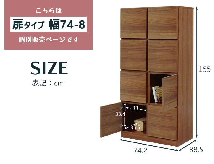 ■ ご購入の前にご確認ください。 配送・送料 当店では商品を配送料無料にてお客様へお届けしておりますが、家具・インテリアは大型のものも多く、一般の宅配便とは異なり特殊な配送契約となっております。したがって今後も低価格・送料無料にての販売を継続する為、配送業者は原則としてご指定承ることができかねます。また、メーカー直送品の商品につきましては一部商品につきまして、代金引換決済がご利用できない商品がございます。詳細は各商品ページに記載してある情報を参考にしてください。 詳細はこちらから ※原則 北海道・東北・沖縄・一部離島のお客様につきましては別途追加送料が掛かります。 ※商品写真の色味は、ご使用のPCの設定等により実際のものと異なってしまう場合があります。予めご了承の程、お願い申し上げます。 ラックW74-扉タイプ4段 【サイズ】幅74.2×奥行き38.5×高さ155cm 【内 寸】幅33×奥行き35.5×高さ33.4cm 【材 質】デルナチュレ 【仕 様】背面化粧仕上げ 【カラー】ブラウン 【備 考】国産品、完成品 【送 料】無料(北海道・東北・沖縄・離島等の一部地域を除く) 【商品紹介】生活感を隠してスッキリ整理整頓ができる国産ラック中が見えない扉付き収納タイプは埃から収納物を守ります。背面化粧仕上げでお部屋の間仕切りとしてもお使い頂けます。オープンタイプのシリーズ展開もご用意しておりますのでお好みに合わせてお選びください。