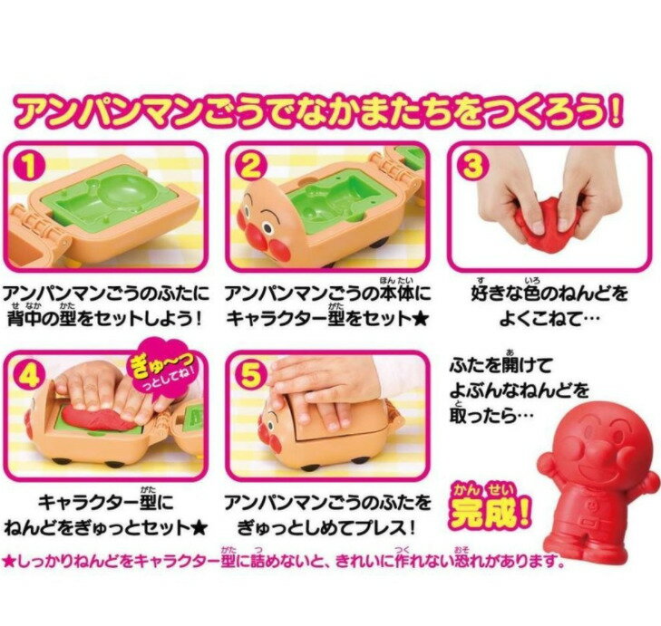 商品情報遊びキャラクターい〜ぱいのねんどセット簡単にアンパンマンと仲間たちをねんどで作れます。作ったねんどはアンパンマンごうにのせて配達遊びなどのごっこ遊びも楽しめます。作り方1、ねんどを型につめます。2、アンパンマンごうのふたをします。3、ふたをあけてねんどをとりだしたら完成!【同梱内容】ねんど約40g×4(赤、青、黄、白 各1)、アンパンマンごう、キャラクター型×8(アンパンマン、ばいきんまん、メロンパンナちゃん、ロールパンナ、カレーパンマン、ドキンちゃん、コキンちゃん、後ろ姿共有型)、プレイシートアンパンマン つくってたのしい ねんどでアンパンマンごうセット アンパンマン玩具 あんぱんまん おもちゃ 3歳 知育 粘土 子供 道具 男の子 女の子 ねんど 3歳~ プレゼント アンパンマン号 クリスマス クリスマスプレゼント こねこね 米粉 こめこ で安心! こねこね 米粉 こめこ で安心 アンパンマン つくってたのしい ねんどでアンパンマンごうセット 【粘土遊び 工作 知育玩具 キャラクター型 バンダイ】キャラクターい〜ぱいのねんどセット簡単にアンパンマンと仲間たちをねんどで作れます。作ったねんどはアンパンマンごうにのせて配達遊びなどのごっこ遊びも楽しめます。 1