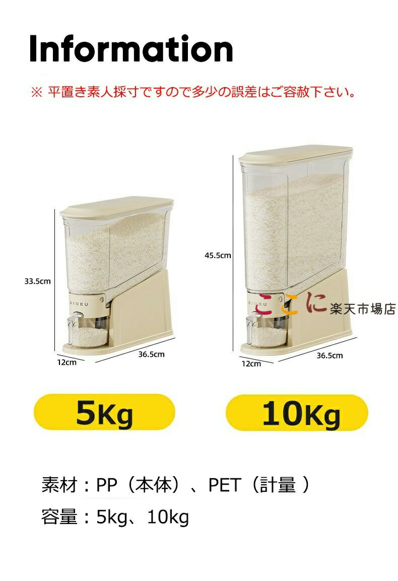 【商品番号】y759655 【カラー】ベージュ、グリーン 【サイズ】5KG:36.5*12*33.5cm/10KG:36.5*12*45.5cm 【容量】5KG/10KG 【材質】PP、PET 【安心素材】食品グレードのPP素材を使用し、シリコンで密封されているため、防湿性があり、十分な気密性を確保します。 【ボタン式】ボタンを押すだけ、お米が出続ける 【内部傾斜設計】内部は傾斜した漏斗設計を採用しており、お米が残らずスムーズに流れ出ます。 【虫除けボックス付き】蓋にポケットが付いている場合は、防虫剤や乾燥剤を入れると密閉性が高まり、お米の品質を保つことができます。 【様々な種類が対応可能】緑豆、小豆、粟、オーツ麦、大麦、米、大豆などを保存可能です。