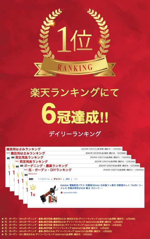 【注意事項】: ・翌日に出荷致します。週末の場合は順延させていただきます。 ・送料無料です。発送後、約1~3日届く予定です。 ・国内配送の商品は国内でのお買い物と同じく消費税が発生いたします。関税はかかりません。 *色がある場合、モニターの発色の具合によって実際のものと色が異なる場合がある。 【PSE説明】: ・PSEマークの種類:菱形 ・届出事業者名:Xiamen JunHao Technology Co.,Ltd ・登録検査機関名:TUV 【軽さ・スピード・切れ味のバランスが良い】:バッテリー装着時はわずか880g。切断径30mmの電動剪定鋏として、軽量となっています。片手で楽に作業できます。ブラシレスモーターを搭載しておりパワフルで切断能力が強い。0.4秒の高速切断で作業効率アップ!植木、庭木、果樹等の剪定作業をサポートします!KT930より軽くて切断スピードが速い機種はほかにはありません。 【あんぜんで使いやすい】:Kebtek充電式剪定ばさみはあんぜんスイッチが組み込まれています。電源スイッチをオンにしても、引金を2回すばやく引かないと、ブレードが作動しません。誤操作による事故を防ぐことができます。引金を長押し、ブレードの切断直径を30mmと20mmの間で切替できます。 【切断面キレイ、木を傷めない】:この電動鋏は日本製のテフロン非粘着性コーディング刃を採用しているため、切れ味が良く、切断面がキレイ、木を傷めず健康的に保つことができます。付着もしにくいです。 【1日の作業に対応可】:Kebtekの電気剪定鋏は大容量2500mAhのリチウム電池が2個付属しています。充電器はバッテリー2個を同時に充電できます。フル充電後、8〜10時間作動できます。1日の作業に十分対応できます。付属のキャリーケースに収納したり、別売りのウェストバッグに入れたりすると、外出作業も楽になります。 【こだわりの外観デザイン&人間工学設計】:Kebtek電動枝切り鋏のハンドル部分はドイツ材質TPR+ABSを採用しています。滑り止めだけでなく、ソフトでコンパクトボディで取り回し快適。長時間使用しても手に負担がかかりません。