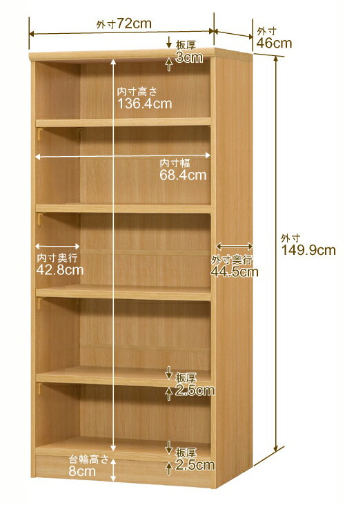 固定棚のない全棚板可動のフルオープン構造 本棚 大型書籍、大型ファイルの大量収納に最適 棚板は耐荷重性に優れたタフタイプ 当店独自の全棚板移動1.5cmピッチと幅木カットが選べます 低ホルムアルデヒド F★★★★サイズ奥行46cm×高さ149.9cm×幅72cm側板(内寸)43.2cm側板(外寸)44.5cm有効内寸幅外寸幅−(マイナス)3.6cm材 質プリント紙化粧繊維板塗 装ウレタン樹脂塗装棚 板厚さ25mm可動固定棚4枚棚 板耐荷重左の耐荷重基準値表を参照棚 板奥行42.8cm奥行46cm×高さ149.9cm×幅72cm