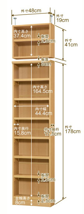 固定棚のない全棚板可動のフルオープン構造 本棚 CD,DVD,コミックの大量収納に最適 棚板は耐荷重性に優れたタフタイプ 当店独自の全棚板移動1.5cmピッチと幅木カットが選べます 低ホルムアルデヒド F★★★★天井つっぱり上置棚サイズ奥行17.5cm×高さ41cm×幅48cm材 質本体・プリント紙化粧繊維板突っ張り金具・スチール塗 装ウレタン樹脂塗装本体:オーダーマルチラックサイズ奥行19cm×高さ178cm×幅48cm材 質プリント紙化粧繊維板塗 装ウレタン樹脂塗装棚 板厚さ25mm可動固定棚6枚棚 板耐荷重左の耐荷重基準値表を参照棚 板奥行15.8cm奥行19cm×高さ226〜235cm×幅48cm