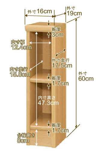 固定棚のない全棚板可動のフルオープン構造 本棚 CD,DVD,コミックの大量収納に最適 当店独自の全棚板移動1.5cmピッチと幅木カットが選べます 低ホルムアルデヒド F★★★★サイズ奥行19cm×高さ60cm×幅16cm側板(内寸)16.2cm側板(外寸)17.5cm有効内寸幅外寸幅−(マイナス)3.6cm材 質プリント紙化粧繊維板塗 装ウレタン樹脂塗装棚 板厚さ17mm移動棚1枚左の移動棚と可動固定棚の違いを参照棚 板耐荷重左の耐荷重基準値表を参照棚 板奥行15.8cm奥行19cm×高さ60cm×幅16cm