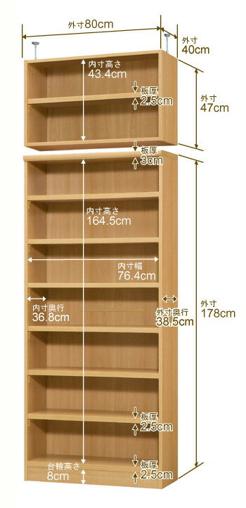 固定棚のない全棚板可動のフルオープン構造 本棚 A4ファイル、雑誌、書籍の大量収納に最適 棚板は耐荷重性に優れたタフタイプ 当店独自の全棚板移動1.5cmピッチと幅木カットが選べます 低ホルムアルデヒド F★★★★天井つっぱり上置棚サイズ奥行38.5cm×高さ47.0cm×幅80cm材 質本体・プリント紙化粧繊維板突っ張り金具・スチール塗 装ウレタン樹脂塗装本体:オーダーマルチラックサイズ奥行40cm×高さ178cm×幅80cm材 質プリント紙化粧繊維板塗 装ウレタン樹脂塗装棚 板厚さ25mm可動固定棚6枚棚 板耐荷重左の耐荷重基準値表を参照棚 板奥行36.8cm奥行40cm×高さ232〜241cm×幅80cm
