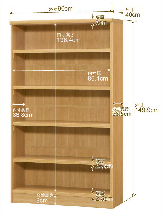固定棚のない全棚板可動のフルオープン構造 本棚 A4ファイル、雑誌、書籍の大量収納に最適 棚板は耐荷重性に優れたタフタイプ 当店独自の全棚板移動1.5cmピッチと幅木カットが選べます 低ホルムアルデヒド F★★★★サイズ奥行40cm×高さ149.9cm×幅90cm側板(内寸)37.2cm側板(外寸)38.1cm有効内寸幅外寸幅−(マイナス)3.6cm材 質プリント紙化粧繊維板塗 装ウレタン樹脂塗装棚 板厚さ25mm可動固定棚4枚棚 板耐荷重左の耐荷重基準値表を参照棚 板奥行36.8cm奥行40cm×高さ149.9cm×幅90cm