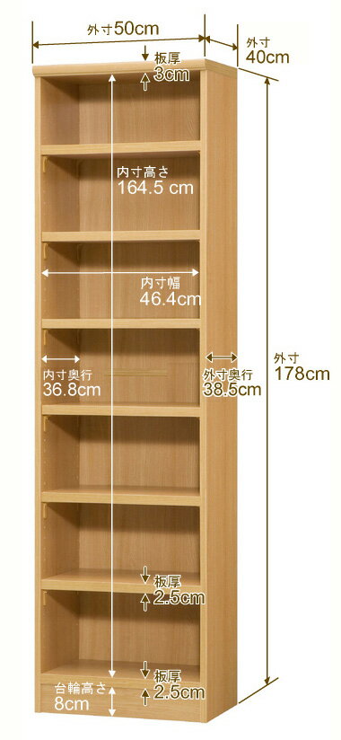 固定棚のない全棚板可動のフルオープン構造 本棚 A4ファイル、雑誌、書籍の大量収納に最適 棚板は耐荷重性に優れたタフタイプ 当店独自の全棚板移動1.5cmピッチと幅木カットが選べます 低ホルムアルデヒド F★★★★サイズ奥行40cm×高さ178cm×幅50cm側板(内寸)37.2cm側板(外寸)38.1cm有効内寸幅外寸幅−(マイナス)3.6cm材 質プリント紙化粧繊維板塗 装ウレタン樹脂塗装棚 板厚さ25mm可動固定棚6枚棚 板耐荷重左の耐荷重基準値表を参照棚 板奥行36.8cm奥行40cm×高さ178cm×幅50cm
