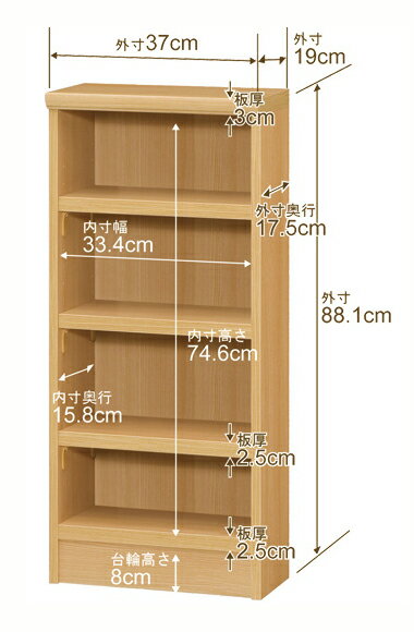 固定棚のない全棚板可動のフルオープン構造 本棚 CD,DVD,コミックの大量収納に最適 棚板は耐荷重性に優れたタフタイプ 当店独自の全棚板移動1.5cmピッチと幅木カットが選べます 低ホルムアルデヒド F★★★★サイズ奥行19cm×高さ88.1cm×幅37cm側板(内寸)16.2cm側板(外寸)17.5cm有効内寸幅外寸幅−(マイナス)3.6cm材 質プリント紙化粧繊維板塗 装ウレタン樹脂塗装棚 板厚さ25mmイージーロック棚3枚棚 板耐荷重左の耐荷重基準値表を参照棚 板奥行15.8cm【イージーロックタイプ】奥行19cm×高さ88.1cm×幅37cm