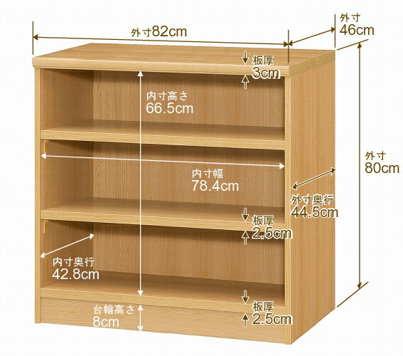 固定棚のない全棚板可動のフルオープン構造 本棚 大型書籍、大型ファイルの大量収納に最適 棚板は耐荷重性に優れたタフタイプ 当店独自の全棚板移動1.5cmピッチと幅木カットが選べます 低ホルムアルデヒド F★★★★サイズ奥行46cm×高さ80cm×幅82cm側板(内寸)43.2cm側板(外寸)44.5cm有効内寸幅外寸幅−(マイナス)3.6cm材 質プリント紙化粧繊維板塗 装ウレタン樹脂塗装棚 板厚さ25mmイージーロック棚2枚棚 板耐荷重左の耐荷重基準値表を参照棚 板奥行42.8cm【イージーロックタイプ】奥行46cm×高さ80cm×幅82cm