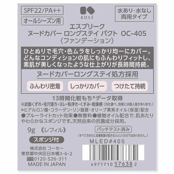 ★ヤマト追跡メール便送料無料★コーセーエスプリーク ヌードカバー ロングステイ パクト(レフィル)OC-405 オークル 9g「資生堂、コーセー正規取扱店】