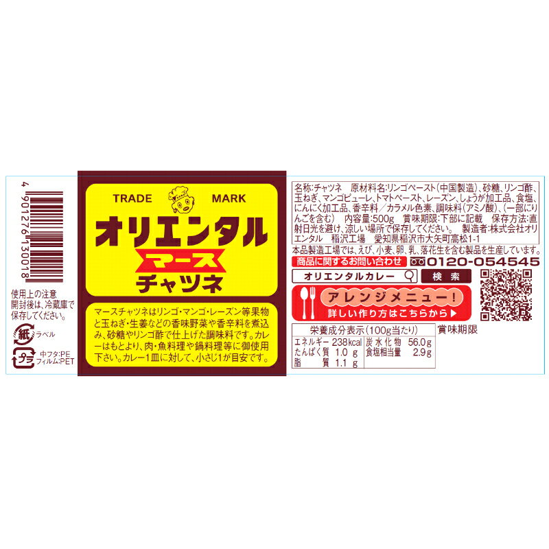 【ISO22000とは】 国際標準化機構(International Organization for Standardization)が定めた食品安全の規格です。チャツネは、リンゴ、マンゴ、レーズン等の果物と玉ねぎ、生姜などの香味野菜や香辛料を大釜でじっくり煮込んだジャム状の調味料で、インドでは欠かせないカレー料理のパートナーです。 カレー以外でも、すき焼き、スパゲッティ、ピザ、焼きそば、お好み焼き、麻婆豆腐、から揚げ、ロールキャベツ、オムレツ、チキンライス、チャーハン、煮魚など、様々な料理の隠し味としてもお使いいただけます。 料理にコクと旨味が加わり、グッと味に深みが出ますよ! 単品購入はこちら。 【商品説明】 マースチャツネ500g 品名 チャツネ 原材料名 リンゴペースト(中国製造)、砂糖、リンゴ酢、玉ねぎ、マンゴピューレ、トマトペースト、レーズン、しょうが加工品、食塩、にんにく加工品、香辛料/カラメル色素、調味料(アミノ酸)、(一部にりんごを含む) 内容量 500g 賞味期限 製造日から12ヶ月 保存方法 直射日光を避け、涼しい場所で保存してください。 製造者 株式会社オリエンタル稲沢工場 愛知県稲沢市大矢町高松1-1