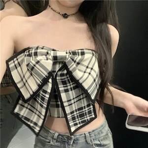 チェック柄 ビックリボンベアトップ ワンカラー