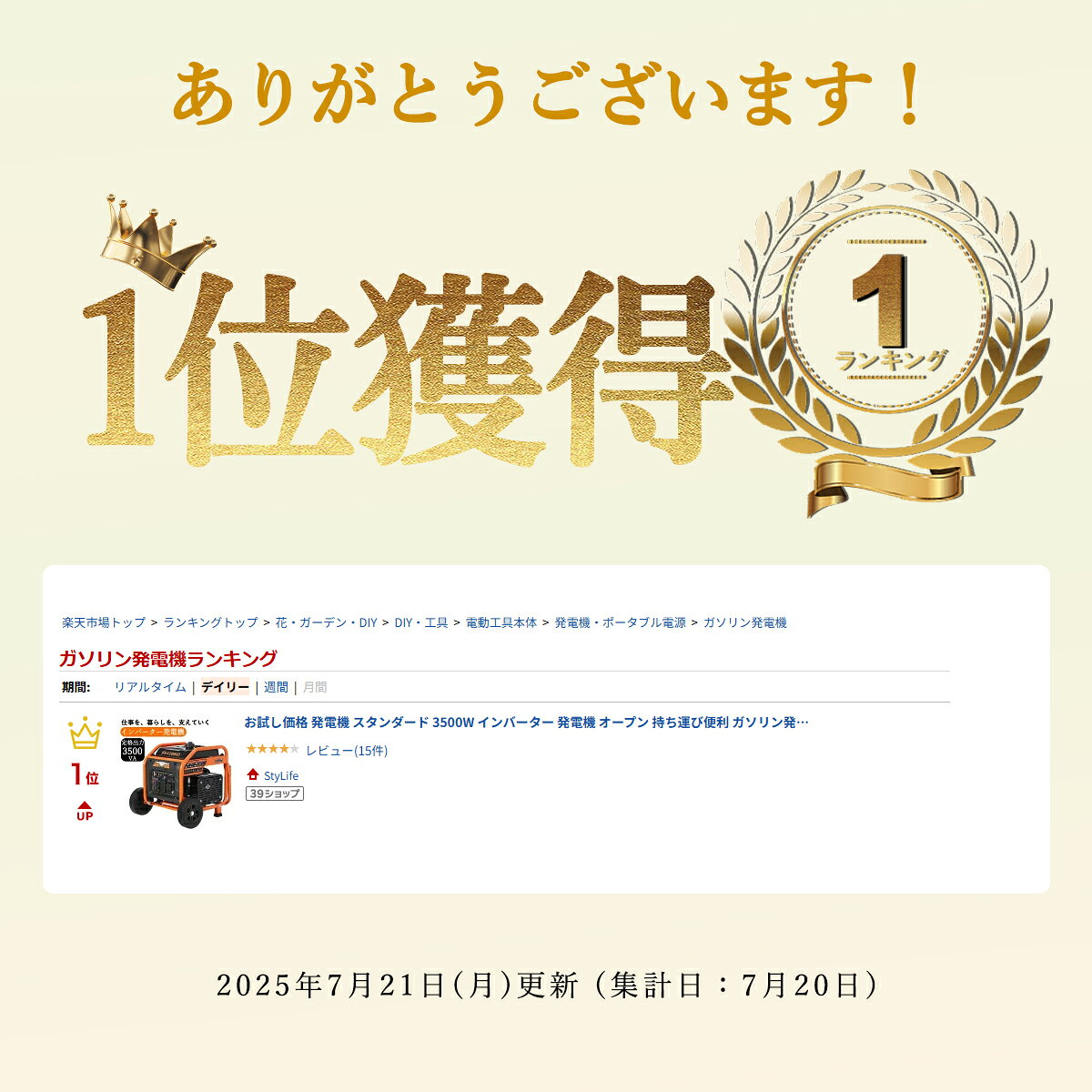 楽天ランキング1位 発電機 スタンダード 3500W インバーター 発電機 オープン 持ち運び便利 ガソリン発電機 家庭用発電機 非常用電源 ポータブル発電機 ポータブル電源 エンジン業務用 停電 家庭用 正弦波 車中泊 キャンプ 台風 地震対策 災害に備え 防災