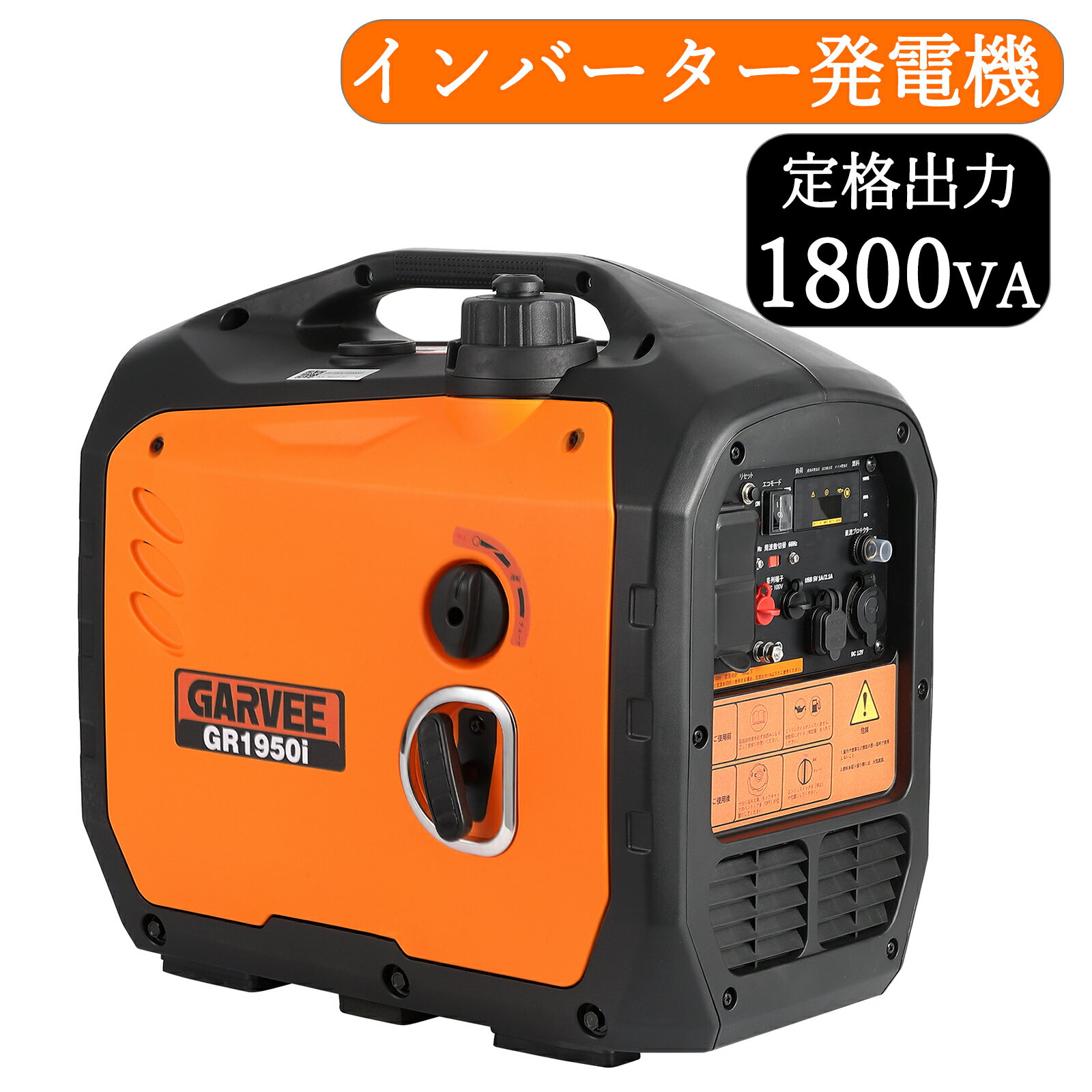 メーカー希望小売価格はメーカーサイトに基づいて掲載しています。商品説明 商品名 インバーター発電機 定格出力 3.1kVA 連続運転時間 約4h(100%負荷)約9h(1/4負荷) 定格周波数 50Hz/60Hz AC出力 100V/20A*2100V/30A*1 DC出力 12V/8A*1 USB USB-Aポート*2 タンク容量 6L 本体重量 約21kg 製品特徴 【高出力ながら片手で持ち運べる】 3.1kVAの高出力で、冷蔵庫、洗濯機、エアコンなどの大型家電だけでなく、建設工事や内装工事などで使用する電動工具にもしっかり対応できます。 【エコモードの採用で、9時間長時間の連続運転を実現】 使用機器の負荷に合わせてエンジン回転数を自動制御することができ、燃料効率が優れており、連続運転時間が大幅に向上します。 ガソリン6Lの場合、定格負荷4H連続運転で、1/4負荷は約9H運転可能です。 【正弦波インバーター】 正弦波インバーターを搭載し、発電された電気の周波数を整え、商用電源と同水準の高品質な電力を供給し、精密機器やマイコン搭載機器の安定した使用を実現します。 【警告ランプ】 過負荷警告ランプ: 接続電気機器への出力が過負荷になると内部の回路を保護するためLEDが点灯し、本機は発電のみを中止します。 オイル警告ランプ 運転中にオイル量が規定レベル以下になると、自動的にエンジンが停止。エンジンの焼きつきトラブルを未然に防ぎます。 【周波数切替機能】 発電する電気の周波数がスイッチ1つで簡単に切り替えられ、50/60Hzどちらの地域でも使えます。 【多重保護装置】 エンジンオイルの不足、過回転、温度が異常上昇した時に自動的にエンジンが停止します。 【3Way出力対応】 AC/DC/USB端子を搭載され、数多くの電化製品を同時に使えます。 【仕様改善!燃料残量表示機能を追加】 多機能表示パネルで、ガソリン残量が一目でわかります。残量を正確に監視でき、燃料切れのリスクをを軽減でき、安心感を持って使用できます。 非常時はもちろん、キャンプやイベント、キッチカーやキャンピングカー、工事現場や日曜大工など幅広くご利用頂けます。 検索キーワード 発電機 インバーター 発電機 最大出力3500W ガソリン発電機 家庭用発電機 非常用電源 ポータブル発電機 ポータブル電源 エンジン 電源 発電機インバーター 停電 家庭用 正弦波 静音 土木 建築 工事現場 車中泊 キャンプ 災害 台風 防災 商品説明 定格出力 1.8kVA 連続運転時間 約4.5h(100%負荷)約11h(1/4負荷) 定格周波数 50Hz/60Hz AC出力 100V/18A*2 DC出力 12V/8A*1 USB USB-Aポート*2 タンク容量 4L 騒音レベル(7m) 64dB 本体重量 約18.7kg