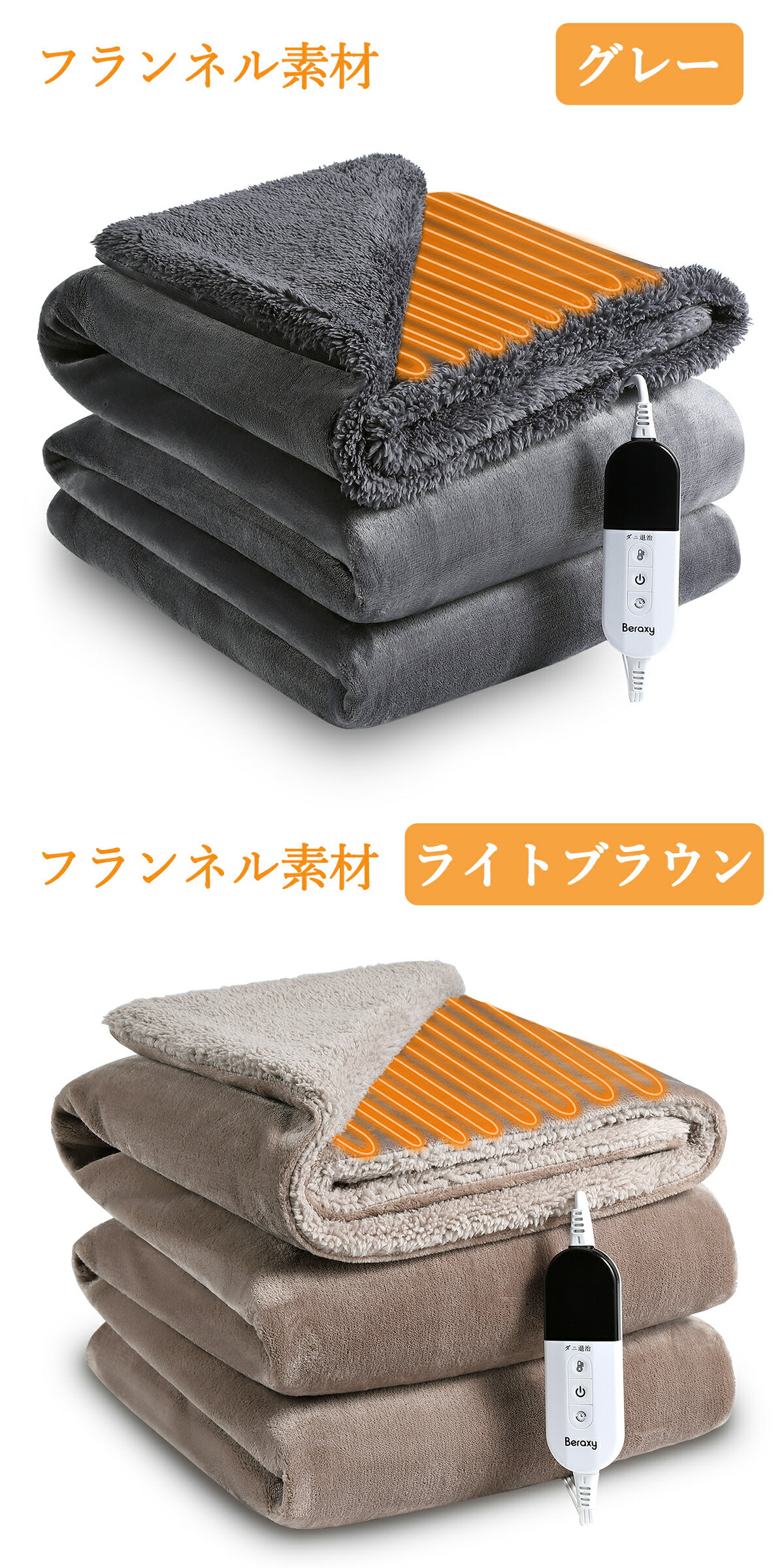 掛け敷き毛布:メーカー希望小売価格はメーカーサイトに基づいて掲載しています。 メーカー希望小売価格はメーカーサイトに基づいて掲載しています。商品説明 商品名 電気毛布掛け敷き兼用 サイズ 約188cm*130cm カラー グレー/ライトブラウン 素材 フランネル素材/ミルクシルク素材 定格電圧 AC 100V~50/60Hz 定格消費電力 100W 温度調節 6段階 コード長さ 電源側:1.85m本体側:2.5m タイマー機能 1〜10時間(1時間単位) 材質 ポリエステル100% 製品仕様 【アップグレード】 10種類タイマー設定可能&電源コードはより長くに 【掛け&敷き兼用】 掛けても、敷いても使える兼用タイプ。就寝時だけでなく、普段はひざ掛けなどとしても使用できます。 【自動OFFタイマー機能】 1時間単位で1〜10時間のタイマーを設定可能で、電気のムダ遣いを抑えられるので節電できます。万が一切忘れをしても安心! 【6段階温度調節】 好みに合わせ温度を細かく調整できます。 【ダニ退治機能搭載】 本体をポリ袋に入れた状態で、温度をレベル6に設定して3時間放置すればダニ退治ができます。 【丸洗いOK】 コントローラーを取り外して洗濯できますので、手間いらず、自宅でもてがるにお手入れできます。 ※必ずコントローラーを外してください。 ※ドラム式洗濯機は使用しないでください。 【電源コードをより長くに】 電源側約1.85m&本体側約2.5m、合計4.35mのロングコードで、コンセントから離れた場所で過ごす際にも電源を取れます。 【ディスプレイのスリープモード】 3分ぐらい経ちますと、液晶ディスプレイの明るさは暗くなります。 10分ぐらい経ちますと、液晶ディスプレイは表示しなくなり消えますが、本体は作動しています。 温度ボタンやタイマーボタンを押すと、液晶ディスプレイは表示されます。 検索キーワード 電気毛布 電気ブランケット 着る毛布 188*130cm ブランケット 着る電気毛布 敷き 電気ひざ掛け 掛け着る両用 電気掛け毛布 掛け敷き 掛敷き 温度調節 裏起毛 柔らか 肌触りいい 暖かい グレー