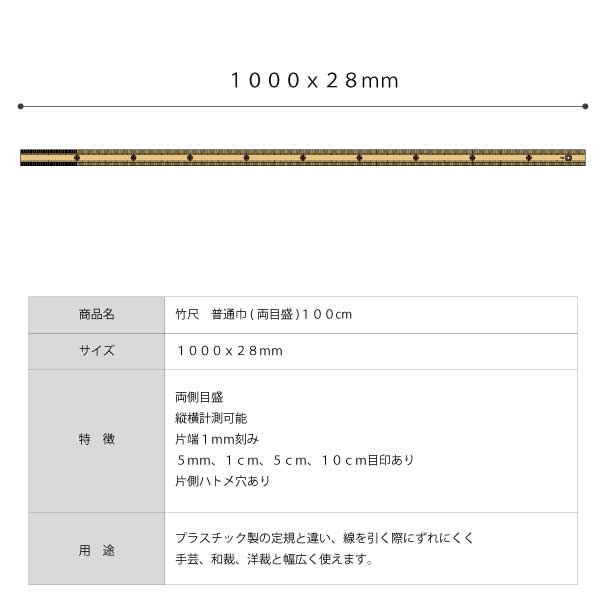 竹尺ふつう幅(両目)100cmハトメ付き 品番:10748 サイズ:1000×28×5mm 入数:1本 用途:和裁、パッチワーク、手芸、溝引き 素材:竹製 軽さと強度と柔軟性を併せ持っており、使うほどにつやが出て手に馴染むのは竹ならでは。 使えば使うほど愛着がわきます。自然の風合いが手になじむ竹製。 竹は湿度や温度により反ってしまうことがありますが不良品ではございません。 竹節はありますが、反っていたりしても、平面に置けば節目が浮くことはありません。 プラスチック製の定規と違い、線を引く際にずれにくく 手芸、和裁、洋裁と幅広く使えます。 ハトメが付いているので、使用しないときは掛けることがことができます。