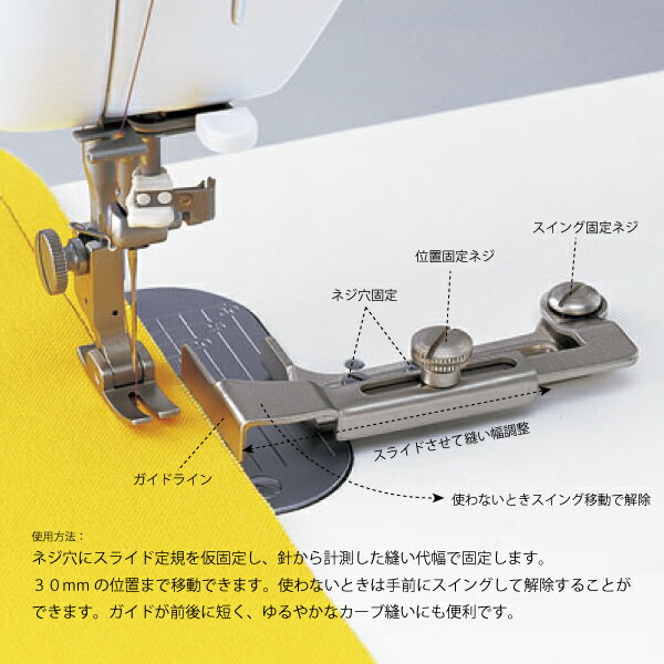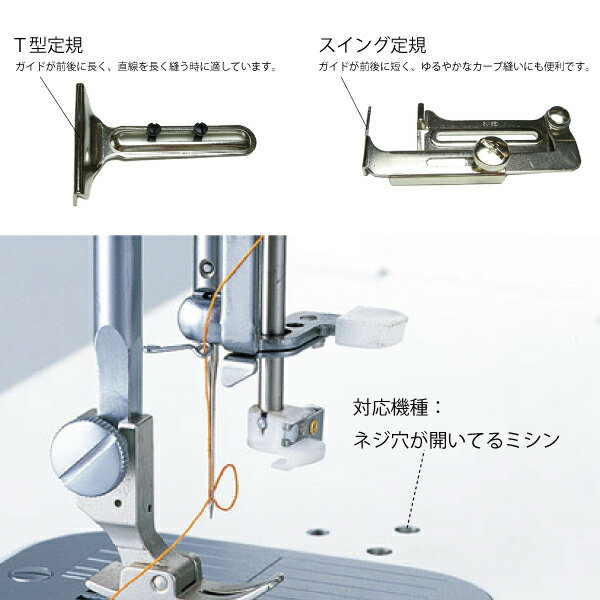 JUKI職業用スイング定規(ネジセット) 品番:70249 ネジ穴がある職業用・工業用ミシン専用。 家庭用ミシンには対応していません。 生地端を沿わせて一定の縫い代で縫うガイドとして使用します。 使わないときは手前にスイングして解除することができます。 ガイドが前後に短く、ゆるやかなカーブ縫いにも便利です。 ガイドは針から30mmの位置まで移動でき、ドライバーまたは手でネジを回して固定します。 ▼ 対応機種一例 ネジ穴がある職業用・工業用ミシン専用。 家庭用ミシンには対応していません。 e="width: 100%; height: 100%;">