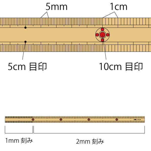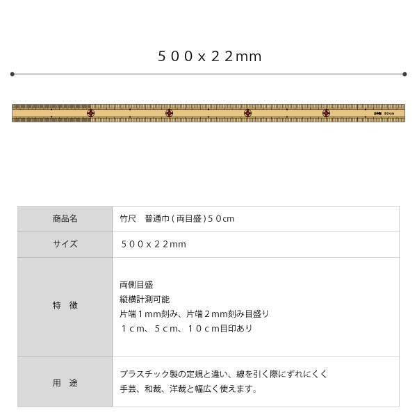 竹尺 (普通巾)(両メモリ)50cmx2.2cm 品番:10740 サイズ:50cmx2.2cm 入数:1 用途:和裁、パッチワーク、手芸、洋裁 素材:竹製 軽さと強度と柔軟性を併せ持っており、使うほどにつやが出て手に馴染むのは竹ならでは。 使えば使うほど愛着がわきます。自然の風合いが手になじむ竹製。 竹は湿度や温度により反ってしまうことがありますが不良品ではございません。 竹節はありますが、反っていたりしても、平面に置けば節目が浮くことはありません。 プラスチック製の定規と違い、線を引く際にずれにくく 手芸、和裁、洋裁と幅広く使えます。