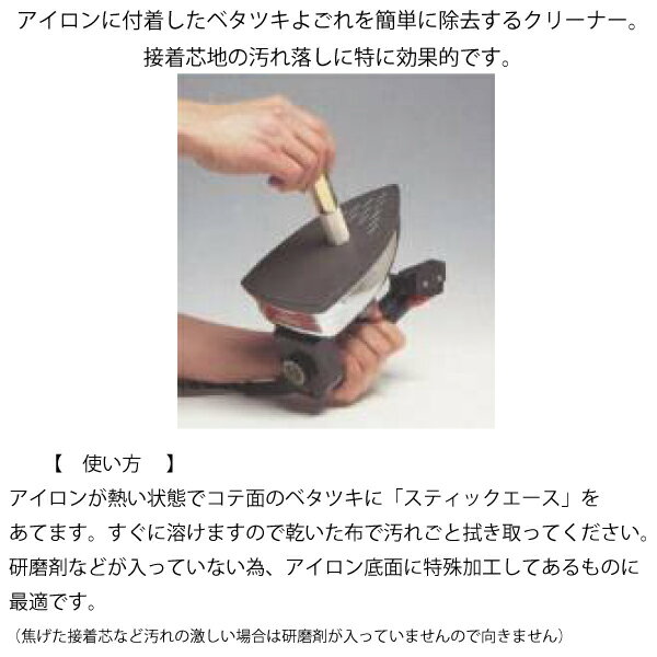 ミズホケミカル アイロンクリーナースティックエース 品番:15163 入数:1 容量:40g 用途:アイロンクリーナー アイロンに付着したベタツキよごれを簡単に除去するクリーナー。接着芯地の汚れ落しに特に効果的です。 使い方 アイロンが熱い状態でコテ面のベタツキに「スティックエース」をあてます。すぐに溶けますので乾いた布で汚れごと拭き取ってください。 研磨剤などが入っていない為、アイロン底面に特殊加工してあるものに最適です。 (焦げた接着芯など汚れの激しい場合は研磨剤が入っていませんので向きません)