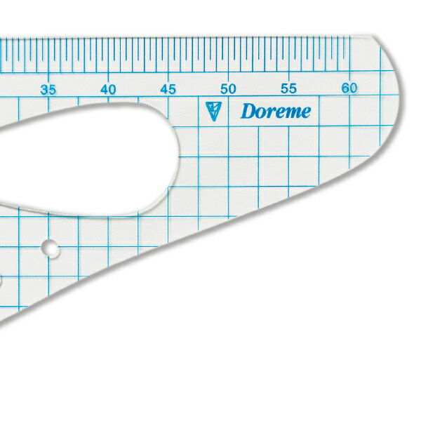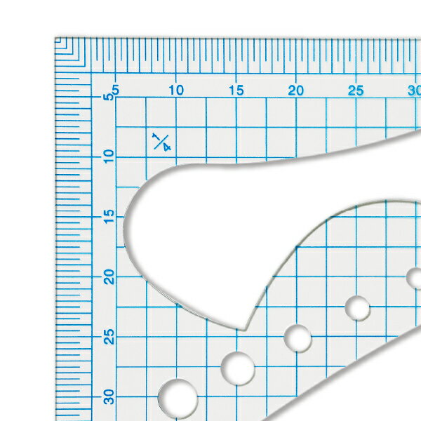 ドレメ透明方眼縮尺定規 品番:10331 入数:1 実際のサイズ:102×160mm 厚み0.8mm 縮尺:1/4 仕様:縮尺定規 用途:製図、パターン展開 材質:塩化ビニル樹脂 印字:耐摩耗性・耐久性に優れていたUV印字 ドレメ式(杉野)の縮尺定規 ・実寸5mm方眼線が入っているので平行線が引きやすい。 ・ボタンを描くときに便利な丸穴6種類つき ・細かな計算をせずに縮尺製図が引けます。 ・側面のカーブでヒップラインや襟ぐりなどの曲線が引けます。 ・図面ラインが見やすい透明プレート ・目盛りは耐摩耗性・耐久性に優れている消えにくいUV印字