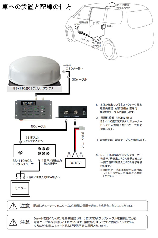 おすすめポイント BS/CS衛星放送の受信には、チューナーだけでなく専用アンテナが必要で、移動するクルマや船舶では「固定式アンテナ」では安定した受信はできません。 この衛星アンテナは、刻々と移動する衛星とアンテナの位置を自動補正。 走行中でもお好きなデジタル衛星番組が楽しめます。キャンピングカー・観光バス・ワゴン車等に最適です。 詳細 ■受信エリアは北海道・東日本・西日本の陸地と沿岸をそれぞれの地域ごとにカバーします。 受信可能放送:BS・110°CSデジタル放送 受信周波数:10.7〜12.75GHz 受信利得:27dBu 受信偏波:右施円偏波 追尾方式:自動(仰角固定) 追尾角度:360°(方位角) 電源電圧:12V DC(1A以下) 付属品 アンテナケーブル10m,チューナーケーブル100cm、電源ケーブル150cm、電源供給器1個 ■バスやトラックなど長距離運行にも難なく対応。強力マグネットで平滑な鉄板面に直付け可能です。 ■従来モデルより少し大きくなり、受信感度が大幅に向上しました。。 受信チャンネル BS:NHK BS-1/NHK BS-2/NHK BShi/BS 日テレ/BS 朝日/BS フジ/BS ジャパン/WOWWOW/スターチャンネル CS:スカパー110°等 ご確認ください ※衛星放送をご覧になるには別途専用チューナーが必要です。 ※チューナー用に100V電源が必要になります。 ※トンネル、ビル、樹木、山岳等衛星とアンテナの間に電波を遮る障害物がある場合は受信出来ません。 ※急な坂道の場合受信出来なくなる場合があります。 ※雲の厚い日や降雨降雪日には受信感度が著しく低下することがあります。 ※船舶での使用はお勧め出来ません。船舶専用モデルをお勧めいたします。 ※船舶で使用の時、船体の揺れやヒール角が大きいと受信できないことがあります。 ※南西諸島、琉球諸島、小笠原諸島では受信できません。 ※CSデジタル放送は沿岸域、西日本日本海側、東シナ海では受信感度が低下する場合があります。