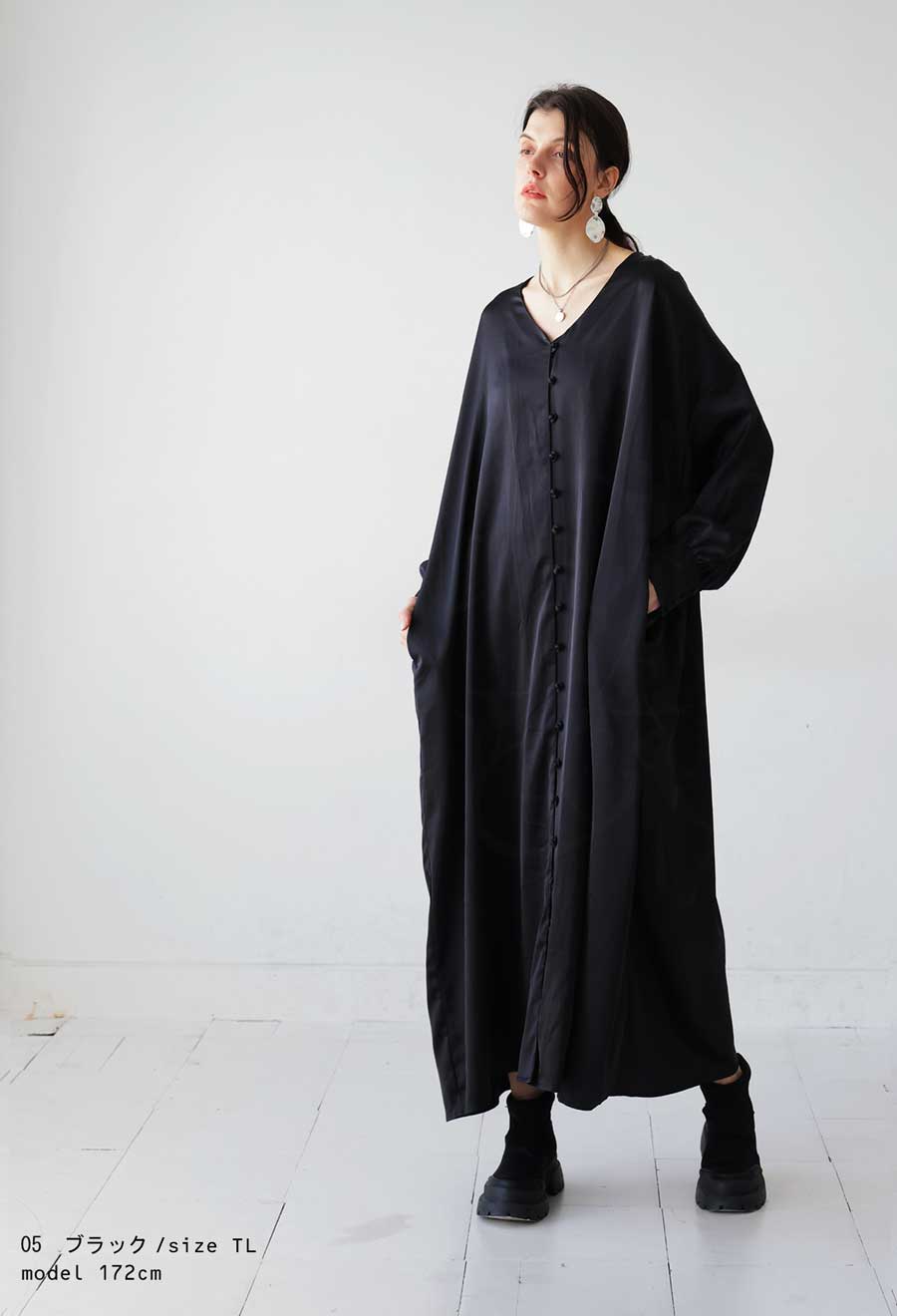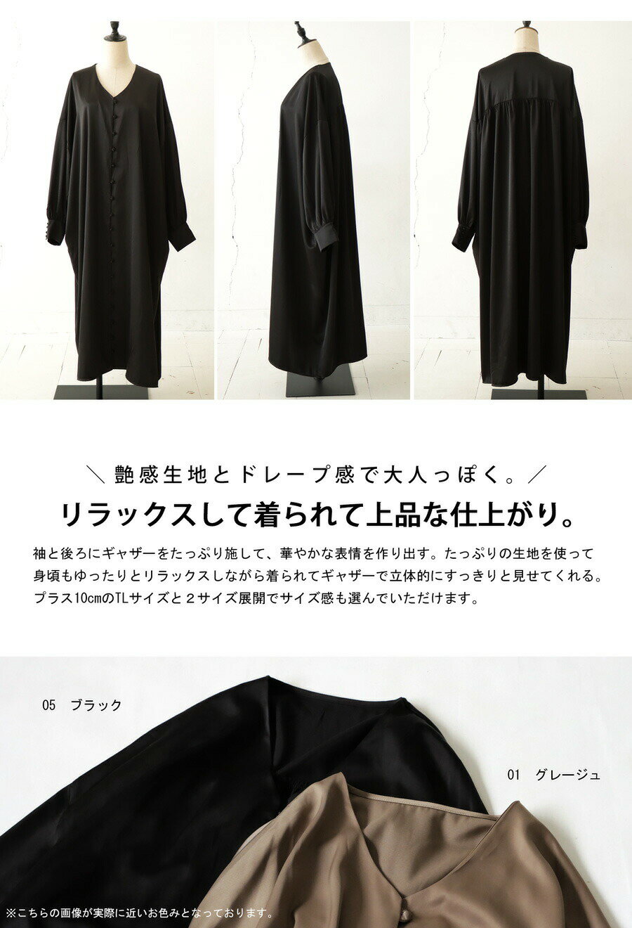 ※こちらの商品は在庫限りのアウトレット商品の為、返品・交換は不可となります。▼▼▼ 艶感生地でレディな仕上がりに。 リラックス感とこなれ感がちょうどいい『Vネックワンピース』 袖とバックにギャザーをたっぷり施して華やかな表情に。 たっぷり身幅でリラクシングなのに、こなれ感もたっぷりでデイリーに使いやすい! ≪DETAIL≫ ・ゆったりと緩やかなAラインシルエット。 ・Vネックで叶える顔回りのすっきり見せ! ・ころんとしたボタンがクラシックで大人可愛い雰囲気をプラス。 ・ポケットも付いて機能面も◎ ・ボタンを全部開けて羽織りとしても◎ ≪FABRIC≫ ・生地の艶感が大人っぽく高級感のある生地。 ・さらりと滑らかな手触りでストレスフリーな着心地。 ・シワになりにくいポリエステル素材でお手入れ楽ちん。 ≪SIZE≫ F・TLの 2サイズ展開! サイズ F TL 総丈 123 132 胸囲(脇下) 164 164 肩幅 70 70 袖丈 47 47 アームホール 50 52 袖口周り 22 22 ウエスト 168 172 ヒップ 176 182 裾周り 190 194 天幅 19 19 前下がり 16 18 ※平置き採寸です。サイズは目安にご参考下さいませ。※サイズには個体差±3cmがある場合がございます。ご了承の上、お買い求めくださいませ。 素材 ポリエステル100% 【検索ワード】Vネックワンピース ワンピ レディース ロング 長袖 羽織り 前開き ボタン 無地 共布ボタン Vネック ギャザー フレア カフス ポケット付き ゆったり サイズ展開 2サイズ シンプル 上品 高級感 きれいめ 光沢 艶感 クラシック ロングシャツ ギャザーワンピース ロングワンピース シャツワンピ 体型カバー マキシ丈 大きめ 大きいサイズ antiqua アンティカ 大人 おしゃれ 10代 20代 30代 40代 50代 60代 春 秋 冬 お洒落 カジュアル かわいい かっこいい あんてぃかメーカー希望小売価格はメーカーカタログに基づいて掲載しています