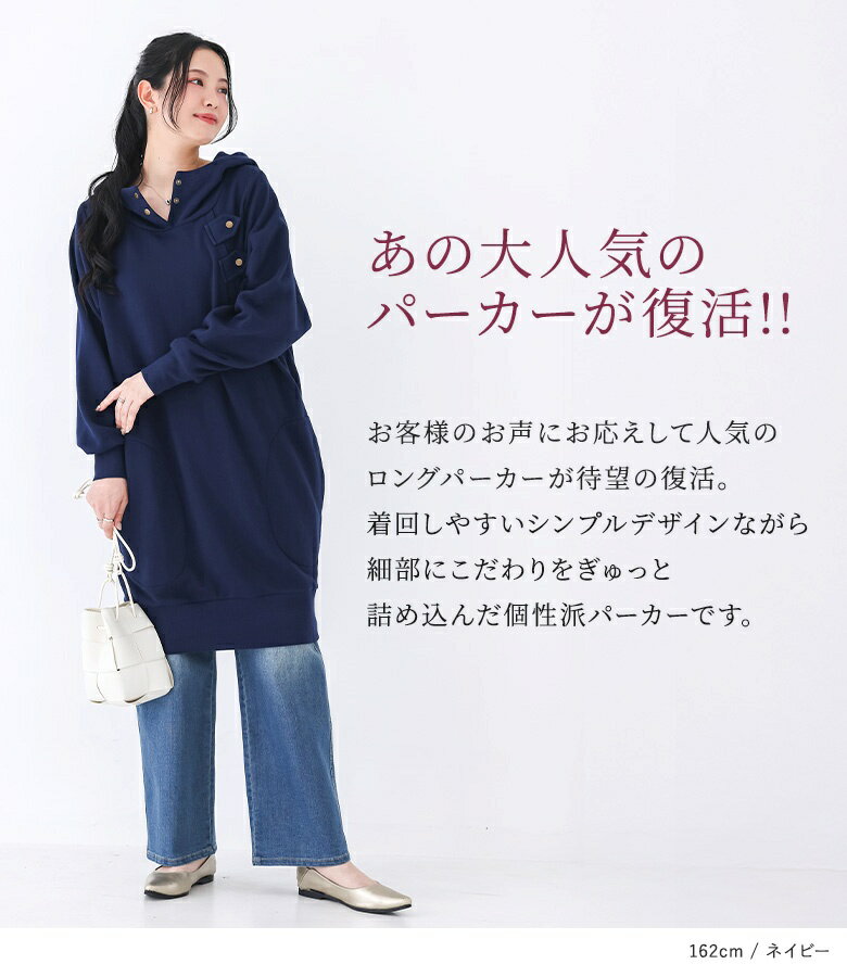 パーカー レディース トップス 長袖 ロング丈 スウェット スエット 裏毛 コットン100% フード付き スタンドカラー 立ち襟 ポケット 体型カバー お尻が隠れる 春 秋 冬 オシャレウォーカー【メール便不可】【20】