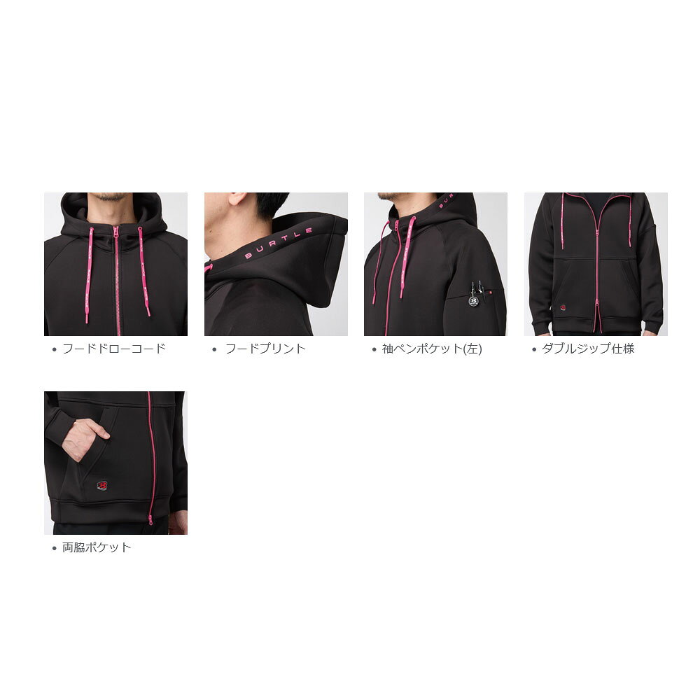 BURTLE エアーテックジップフーディ(4110) 商品説明 ☆冬場のワークシーンの質を高める保温性や、ストレッチ性を有する段ボール断面構造のダブルニット素材を使用しました。☆不快なニオイを抑える消臭テープ付きです。☆静電気を抑える制電ケア糸を使い快適な着用感をサポートします。☆左右腰部にポケットが付いております。また、左袖にペンポケット付きです。☆スポーティなルックスも魅力のデイリーに活躍するエアーテックシリーズです。☆数量限定モデルのため、売り切れ次第、販売終了となります。☆3980円以上のお買上げで送料無料となります! 素材・色・サイズ 【素材】ポリエステル90%・ポリウレタン10%(ストレッチダブルニット)【色】35ブラック / 83ピンク / 72メタリックゴールド【サイズ】M L XL XXL サイズ表
