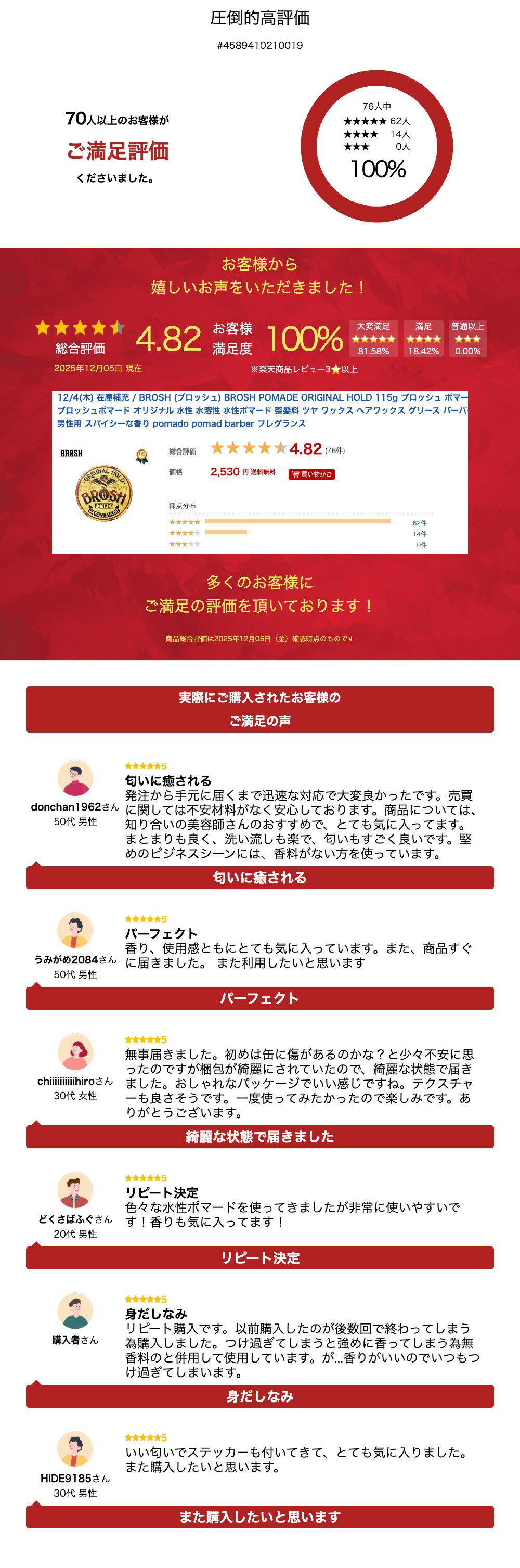 ギフト対応 ■『書いてお得なレビュー特典』詳細はこちら ■『ギフトラッピング無料』詳細はこちら 商品説明 ■注意点 ・パッケージ (ケース) の材質の性質上、表面に多少のへこみや傷、中身が寄ってしまったりなどの状態が見られる場合がございますが、これらは現在のところメーカーからの輸送中にどうしても生じてしまう状況でございます。 (メーカーの出荷基準は満たしています) 以上の点によるご返品は、誠に勝手ながら承る事ができませんので、その旨も重ねてご了承頂いた上、お買い求め下さい。 【BROSH (ブロッシュ) BROSH POMADE ORIGINAL HOLD 115g】 新進気鋭のバーバーショップ MR.BROTHERS CUT CLUB とレジェンドとして業界に君臨する BARBER SHOP APACHE の両店がコラボレーションし造り上げたフルジャパンメイドのポマード "BROSH POMADE" 。 日本人の髪質でもしっかりと抑えつけられる強いホールド力を実現し、手に取って伸ばす際も煩わしさのない伸びの良さ、髪へ塗布した後もべたつかない、水性なのでシャンプーで簡単に洗い流せるという、操作性の高さを兼ね備えた高品質ポマードになります。 こちらは「BROSH POMADE」の起源となる製品「ORIGINAL POMADE (ORIGINAL HOLD)」になります。 強い粘り気と伸びの良さを両立したことで、欧米人に比べ、硬めの傾向にある日本人の髪質にマッチし、その艶感とホールド力はジェルとワックスの要素を兼ね備える仕上がりとなっています。 香料においても0から開発され、ラグジュアリー感のある香りはスパイシーでありながら、フレグランスの効果を併せ持ち、大人の男をさりげなく演出します。 パッケージのデザインは、オールドアメリカンをコンセプトに唐草をリメイクしたデザインを取り入れ、日本の伝統的なエッセンスを加えたオリジナルデザイン。 フクロウはトラディッショナルタトゥーなどでもよく用いられるモチーフで、日本における意味合いとしては旧くから "不苦労の象徴" 、 "知や財に関する縁起の良い生き物" として知られるもの。 アメリカンカルチャーを踏襲したスタイルと、このポマードを通してすべての人が幸せになる手伝いをしたいという作り手の思いが表現されています。 ポマードの種類 - 水性 (シャンプーで洗い流すことが可能) セット力 / ホールド力 - 強い 伸び - 良い 艶感 - あり 香り - ラグジュアリー感のあるスパイシーな香り [使用方法] 適量を手のひらに取り、よく伸ばしてからスタイリングしてください。 [ご使用上の注意] ●お肌に異常が生じていないかよく注意して使用してください。 ●化粧品がお肌に合わないとき即ち次のような場合には、使用を中止してください。 そのまま化粧品類の使用を続けますと、症状を悪化させることがありますので、皮膚科専門医等にご相談されることをおすすめします。 (1) 使用中、赤み、はれ、かゆみ、刺激、色抜け (白斑等) や黒ずみ等の異常があらわれた場合 (2) 使用したお肌に、直射日光があたって上記のような異常があらわれた場合 ●目に入ったときは水かぬるま湯ですぐに洗い流してください。 ●使用後はしっかりフタをしめて保管してください。 ●高温の場所や直射日光のあたる場所には保管しないでください。 ●メガネ等の樹脂を痛めることがありますのでご注意ください。 ※条件により色変わりすることがありますが、品質に問題ありません。 [成分] 水、セテアレス-25、ヤシ油脂肪酸PEG-7グリセリル、ペンチレングリコール、グリセリン、PVP、PEG-40水添ヒマシ油、香料、シメチコン、ポリアミノプロピルビグアニド、フェノキシエタノール、青1、黄4、赤227 【原産国】 日本 【製造販売元】 株式会社コア 【発売元】 BROSH Inc. 広告文責:有限会社LINKAGE 電話:0554-56-9124 商品区分:化粧品 [ヘアスタイリング剤/ブランド:BROSH(ブロッシュ)/] 無香料タイプの「BROSH POMADE UNSCENTED」、マットタイプの「BROSH CLAY POMADE」、動きのある軽やかな質感と独特なテクスチャーを兼ね備えた「FIBER POMADE」も別ページにて販売しております。 こちらの商品をご覧の方は、以下の検索をされています。 ブロッシュ ブロッシュ ポマード ポマード 整髪料 pomado pomad brosh ポマード ブロッシュ ポマード ポマード ポマード ブロッシュ ポマード 水性 メンズ ポマード メンズ スタイリング剤 ポマード ご注文の前にご確認ください ■お客様のご利用のパソコンや環境によって色の見え方が違ったり、実際の商品と色味が多少異なって見える場合がございます。 ■サイズはスタッフによる手計測のため、商品に因っては上記の寸法と多少誤差が出ることがございます。 >>詳細はこちら ■当店では実店舗、複数のオンラインショップと在庫を共有しております。 その為在庫有になっている商品でも、商品の売り違い、在庫の確保不可が稀に生じることがございます。ご了承下さい。 ■送料全国一律600円 (一部地域除く) 合計3,980円 (税込) 以上で送料無料! 13:00までのご注文は即日発送! (定休日、水曜日を除く) ■色やサイズに関するご質問