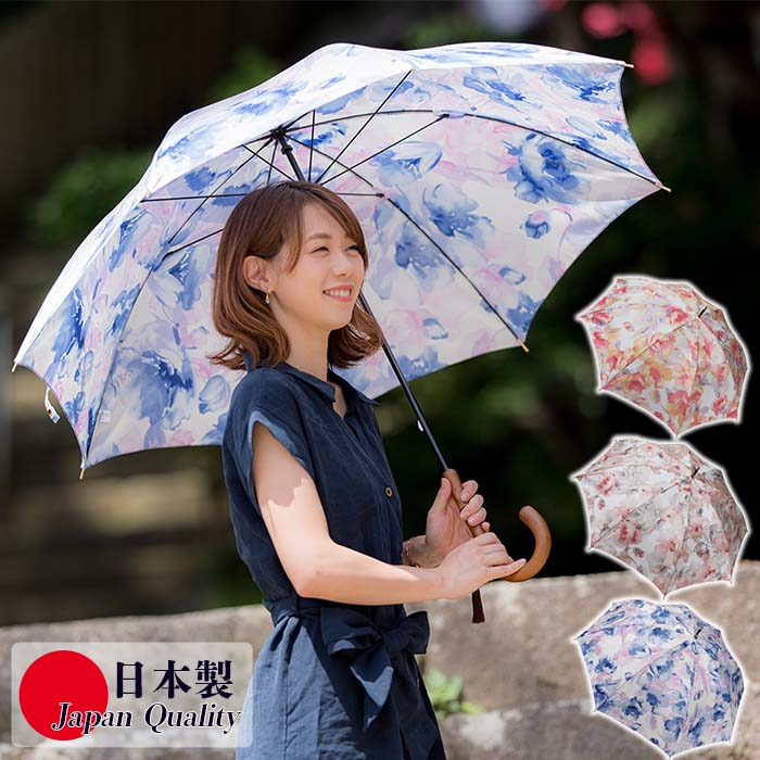 日本製 花柄 傘 レディース 雨傘 長傘173602 おしゃれ 上品 プリント シャンタン バックサテン 手開き 高級 母の日 プレゼント ラッピング ベージュ ピンク ブルー 国産 エレガント