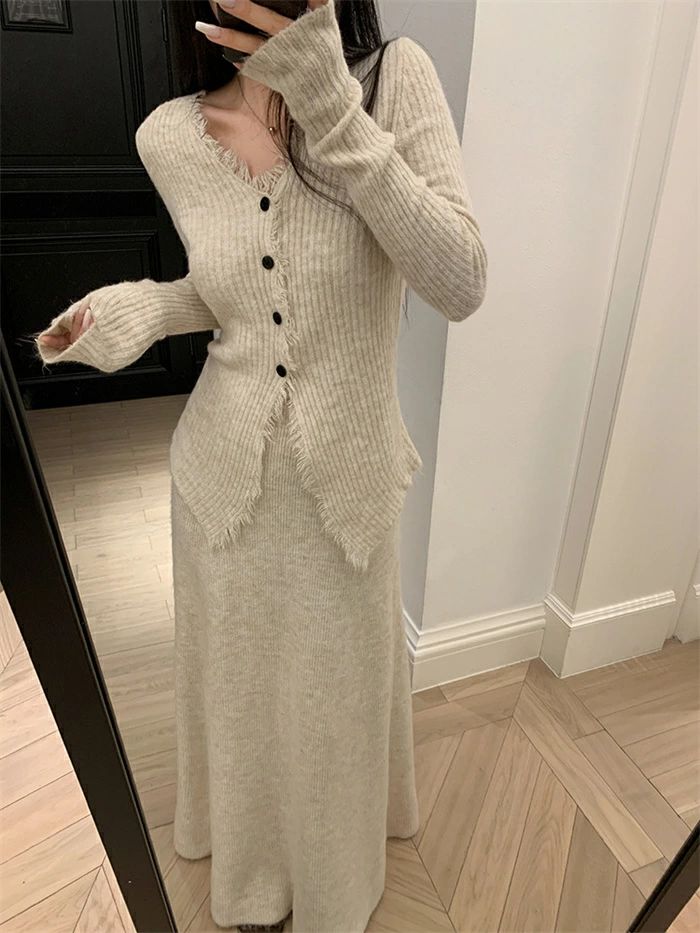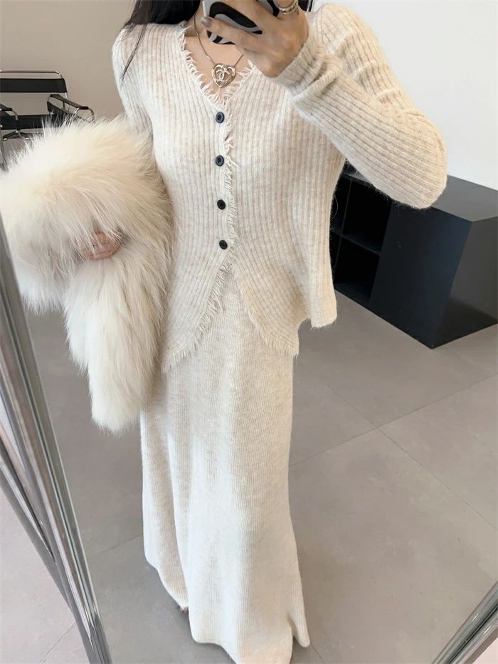 ニットセットアップ スカートスーツ フリンジ レディース 秋冬 2点セット ニット セットアップ 上下セット きれいめ セーター 長袖 ニットスカート 無地 カットソー ゆったり 体型カバー 着痩せ フェミニン あったか おしゃれ 可愛い 忘年会 披露宴 謝恩会 新年会 二次会