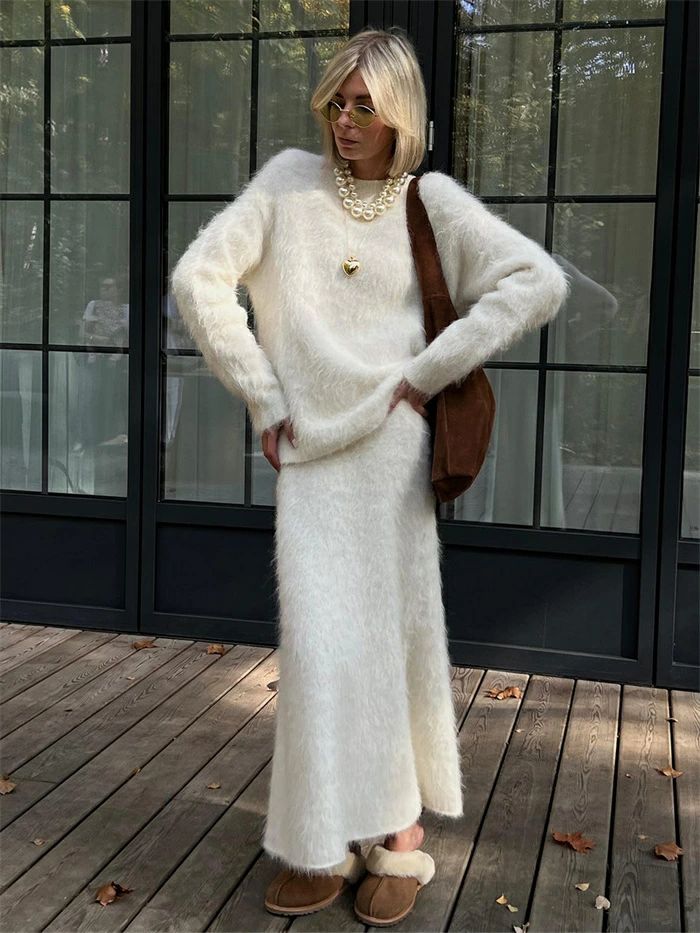 ニット セットアップ モヘア シャギーニット 秋 冬 レディース ニット スカートスーツ 長袖 セーター ロング スカート 2点セット キレイめ 優雅 セット ロングスカート ニットスカート おしゃれ カジュアル 通勤 OL 体型カバー 着痩せ 無地 オフィス 送料無料