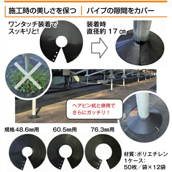 商品情報 特徴 パイプ際からの雑草防止パイプカバー! ●パイプと防草シート等の隙間を「でか丸君」で覆うことで、光を遮断し雑草の繁茂を防止します。●パイプと防草シート等の隙間に飛来する雑草種子が入り込むことを防止します。 ●「でか丸君」でカバーすることで、美しい景観を保つことができます。 ●ワンタッチで装着ができるため、取り付けも簡単に行えます。 ●ヘアピン杭と併用することで、さらにガッチリと固定できます。 商品名 でか丸君 仕様 適用パイプ: φ76.3mm用 装着時の直径: 約17cm 材質: ポリエチレン 色: 黒 入数 50枚 メーカー 槍木産業 備考 ※リニューアルに伴い、パッケージ・内容等予告なく変更する場合がございます。予めご了承ください。 Powered by EC-UP