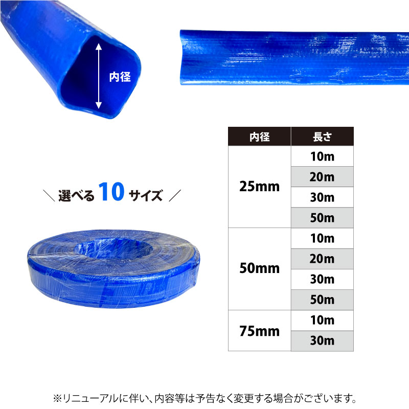 商品名 おてんとさんオリジナル/送水ホース 商品特徴 送水・排水・給水・汚水処理、灌漑などにご使用いただけます。 規格(内径x長さ) 75mm×30m 入数 1巻 製造国 中国 注意事項 ・ガラス、釘などの突起物に触れると傷が付く恐れがあります。 ・極端な曲げ・ねじれや、車など重量物の乗り上げでは変形する場合がございます。 ・直射日光、重い物を乗せたままの保管は避けてください。 ※リニューアルに伴い、パッケージ・内容等予告なく変更する場合がございます。予めご了承ください。