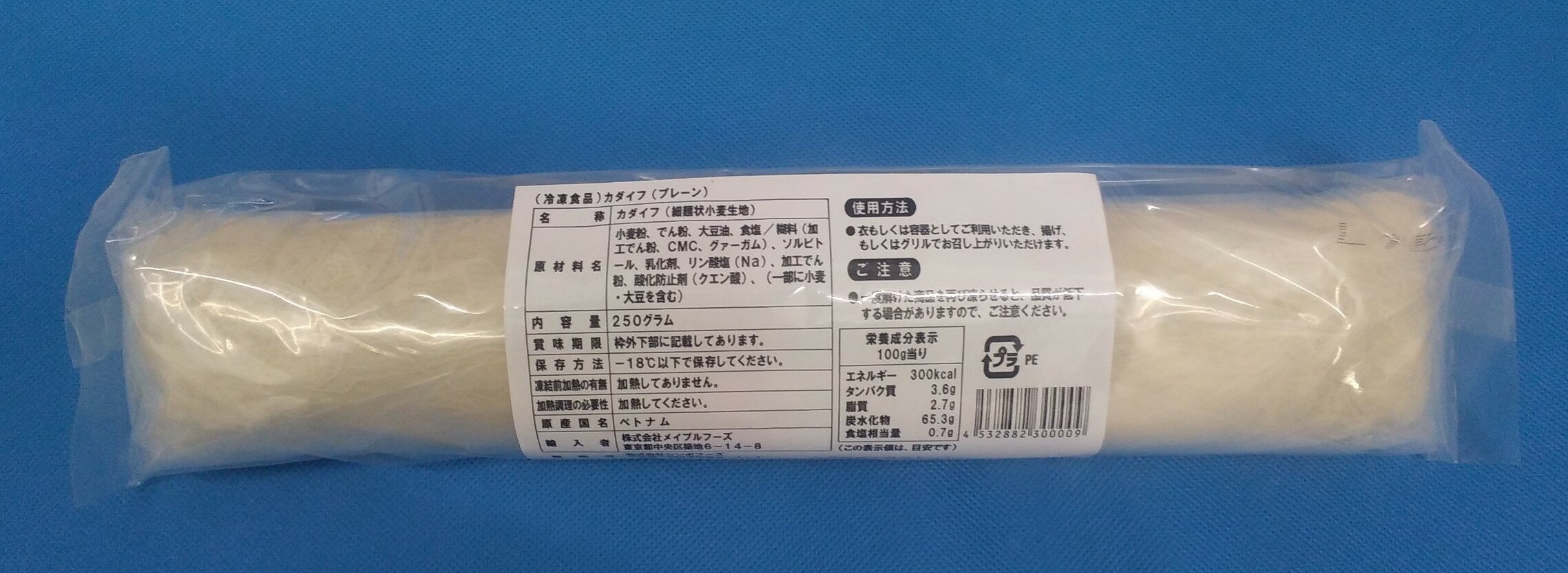 パートカダイフ 250g の詳細 名 称 パートカダイフ 内 容 250g 原材料 小麦粉、でんぷん、大豆油、食塩 / 糊料(加工でん粉、CMC、グアーガム)、ソルビトール、乳化剤、リン酸塩、加工でん粉、酸化防止剤、(一部に小麦・大豆を含む) 原産国 ベトナム 賞味期限 商品に別途記載 保存方法 冷凍保存(0?5℃) 輸入者 株式会社シンポフーズ東京都大田区平和島 発送方法 冷凍 同 梱 冷凍品の同梱ができます。 栄養成分 パートカダイフ について パートカダイフは極細のパスタのような麺です。 天使の髪などと表現され、独特のサクサク感が人気のカダイフ。トルコ料理で伝統的に使われている細麺状の小麦粉生地です。肉や魚の揚げ物、焼き物用の衣によく使用されますが、もともとはデザートとして使われていた食材です。ドバイチョコにもご使用いただいております。 衣にしたてて揚げ物に、 お菓子作りに・・・・ 焼いたり揚げたりパリパリとした食感が楽しく、さくさくした食感がなんともいえません。 「パートカダイフ」は洋食はもちろん和食にも中華にも使える、料理人にひそかな人気の食材です。トプカプ宮殿のお菓子 「パートカダイフ」の特徴 ギリシャやトルコを起源とする極細の麺状の生地 ぱりぱりっとしてサクサクした食感 お料理にもお菓子にも 揚げ物の衣として、お菓子のトッピングとして プロ仕様の食材 おすすめ調理例 海老のカダイフ揚げ、ホタテや白身魚のフライ、バナナフライ、モッツァレラチーズのキュネフェ(カダイフの間にチーズを入れて焼いた温かいデザート)ドバイチョコなどベトナム産 カダイフ トルコ麺 250g カダイフ製品のラインナップ 有頭海老のカダイフ巻き ベトナム産バナメイエビ使用 約24g10本入り ワタリ蟹爪カダイフ 巻き ベトナム産わたり蟹使用 約20g 10ヶ入り 尾付きむきエビカダイフ串 ベトナム産バナメイエビ使用 約11g18本入り