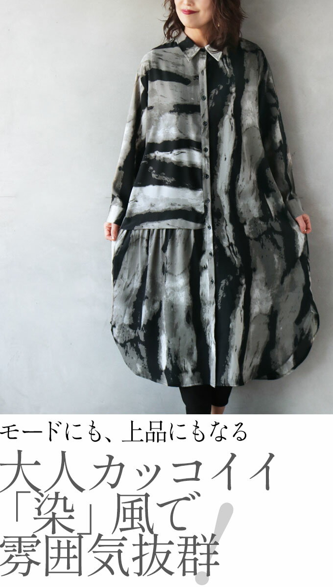 ワンピース レディース ブラック 春 夏 秋 冬 シャツワンピ 長袖 ロング 薄手 シワにならない 羽織り 柄 タイダイ 落ち感 モードで個性的 タイダイ風シャツワンピ 4/11[PS][5]