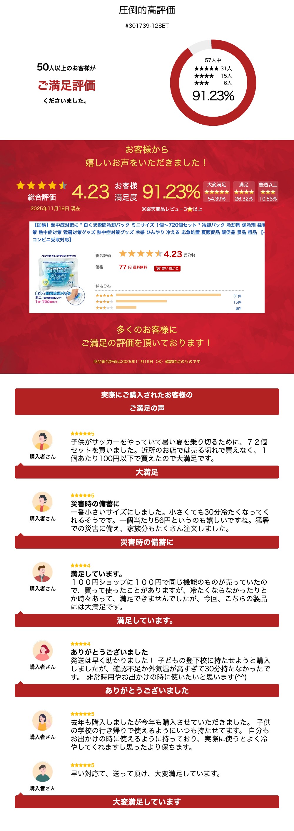 【使用方法】 本品の中に水袋と冷却剤が入っています。 手順どおりに水袋を破裂させると冷却剤と混ざり冷たくなります。 1.本品の中の水袋を指先で確認してください。 2.本品を平らな場所に置き、水袋をゲンコツで強めに叩き、破裂させてください。 3.よく振って水分と硝酸アンモニウムカルシウムを混ぜあわせてください。 周囲の温度などご使用時の状態により保冷時間や温度は異なります。 【使用上の注意】 ●本品は食べられません。口に入れたり、飲んだりすることは絶対にしないでください。 ●万一飲み込んだ場合には、大量の水を飲ませ吐き出させてください。 また目に入った場合には、流水でよく洗い流してください。 応急処置後は直ちに専門医に相談し、診断や処置を受けてください。 ●本品が破け、中の液体が皮ふや衣類についた場合は流水で十分洗い流してください。 ●急激に温度が下がりますので、体や肌に当てるときは ハンカチやタオルなどで包んでご使用ください。 ●長時間直接肌にあてると凍傷になる恐れがありますのでご注意ください。 特に乳幼児、皮ふの弱い方へのご使用は十分ご注意ください。 ●針や刃物など、突起物や鋭利な物の近くで使用または保存する場合は、 本品が破れないように特にご注意ください。 ●使用後は燃えないゴミとして捨ててください。 なおその際には本品が他の廃棄物により破れることのないようご注意ください。 ●本品は液体物の制限対象となっており、内容量が100ml(g)を超えるため、機内に持ち込めない場合がございます。 また、預け入れが可能かどうかについては、航空会社によって異なりますので、 恐れ入りますが、直接航空会社にお問い合わせいただけますようお願いいたします。 参考として、ANA、JALでは特に制限はありません。 【保存方法】 ●直射日光を避け、涼しいところに保存してください。 ●本品を高温の場所に放置すると冷却剤が溶けて中身が固まることがありますが、 水袋を破裂させれば冷却は始まります。 ●本品の上に重いものをのせないでください。水袋が破裂する可能性があります。 ●お子様の手の届かない場所に保管してください。 【再利用について】 ●使用後の本品は冷凍庫に入れて冷やすと保冷剤として再利用できます。 但し叩くだけで冷たくなる瞬間冷却パックとしての使用はできません。 また袋が傷ついている際は使用しないでください。 ▼夏の必需品!当店取扱い冷却パックはこちら▼ ▼熱中症対策に!!!!暑い夏に活躍する猛暑対策グッズ▼ 関連商品【即納】白くま瞬間冷却パック レギュラーサイズ 1個〜360個セット ...【即納】白くま瞬間冷却パック 長時間クール 12個〜240個セット 瞬...*リラックス 急冷ひえひえクールパック ミニ 48個セット(1c/s)...131円2,231円4,382円*リラックス 急冷ひえひえクールパック ミニ 144個セット(3c/s...冷却シート 2枚入 200セット(1c/s)(16-013) 名刺ポケ...【冷凍おしぼり大量購入】ICE! おしぼり 1,200本セット(1c/...12,830円13,420円11,616円【ノンアルコール】からだきれい ウェットタオル 1本入 180セット(...暑さ対策の手引きせんす 100個セット(7379-60) 夏 暑さ対策...暑さ対策の手引きせんす 300個セット(7379-60) 夏 暑さ対策...11,880円11,440円31,350円品質と価格に自信!コストパフォーマンス抜群!! 大きさ、持続時間ともに優れています。 お客様から生まれた「白くま瞬間冷却パック」を 是非お試しください! シンプルなデザインなので、販促用に最適です。 夏のイベント販促品にオススメ! また、熱中症対策、猛暑対策として、学校、工事現場、老人ホーム、スポーツ施設の備蓄としても重宝します。 ねんざの応急処置にもご使用できます。 パンッ!とたたけばすぐに冷却がはじまるので、どなたでも簡単にご使用できます。 使用後は保冷剤として再利用も可能です。 ■白くま瞬間冷却パックおススメポイント1 パッケージにアルミ素材を使用。冷却効果をより実感! ■白くま瞬間冷却パックおススメポイント2 ミニサイズは持ち運びしやすいサイズで冷却持続時間が約30分間! レギュラーサイズは大きめで冷却持続時間が約45分間と長時間! 長時間クールはレギュラーと同サイズで冷却持続時間が約60分とさらに長い! ※室温23℃での静置による計測値です。周囲の温度などご使用時の状態により異なります。 体温や気温が高い場合、保冷時間が大きく変わる場合もあります。 ■白くま瞬間冷却パックおススメポイント3 当店がお客様からのご意見を参考にして開発しました! 数多くの冷却パックを販売するなかでお客様からいろいろな要望をいただきました。 お客様から頂戴した貴重なご意見を商品につなげたいと思い、 自社で冷却パックを開発しました。お客様の声から生まれた冷却パック。 低価格で実現いたしました。 ■お客様からのご意見を参考に商品改善しました! 「パッケージの角がするどいので、子供が安全に使用できるように角が丸いと嬉しいです」 というお客様からのご意見を参考に、