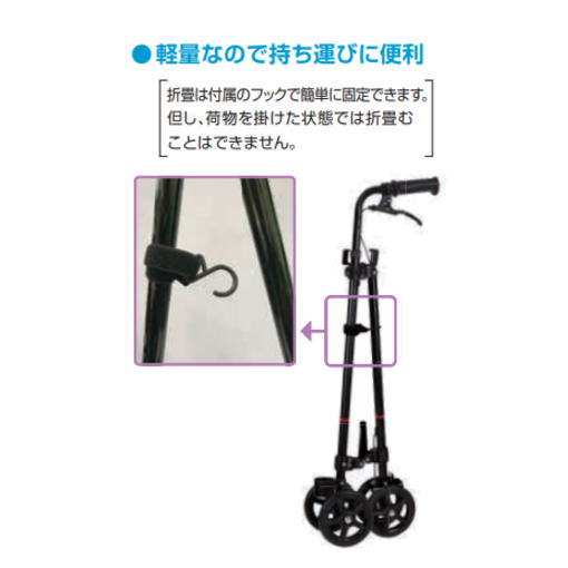 商品名 ハンドレールステッキ2 内容量 1点 サイズ 使用時:幅17×奥行45×高さ76〜88cm 折畳時:幅17×奥行27×高さ80〜89cm 重量:約1.8kg 対応身長 約150〜175cm 素材・材質 グリップ:PP、エラストマー フレーム:アルミニウム 商品説明 手すり感覚で使用できる車輪付きステッキ ○前輪は「固定」と「フリー」がワンタッチで切り替え可能。 本体を固定すればサイドカートとして、フリーにすればハンドルを斜めにして荷重をかけながら使用できます。 ・前輪は安定感のある大型車輪で段差や溝もスムーズに超えます。 ・後輪は歩く足に当たりにくく幅を狭くしています。 ○サイズ調整用ネジ 身長に合わせて高さ調整ができます。 ○軽量なので持ち運び便利 折畳は付属のフックで簡単に固定できます。 ○ハンドルは軽く操作ができるので方向変えがスムーズです。 ○荷物掛け用フック 買い物袋やかばんを掛けられるので便利です。 荷物を掛けることにより重心が安定します。 ○お手もちのステッキと一緒に使うと、より安定して歩行することが可能。 ○傘・ステッキ受け付き 面ファスナーと受けで傘やステッキを固定できます。 ○サイドブレーキ付き ※正しい使い方でご使用ください※ ・腰の横に近づけて体を押すような感じで使います。 ・グリップ部を体の前に出したり、腰から離して使用すると、ハンドルがフラフラして安定しないので危険です。