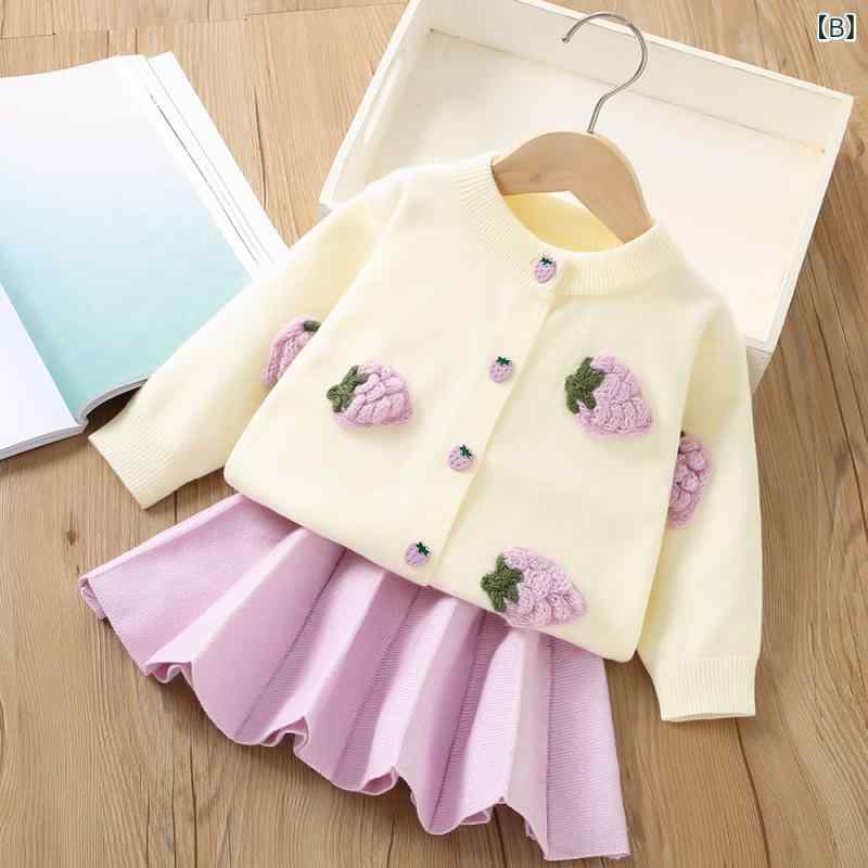 ニット セットアップ 女の子 キッズ セーター 長袖 スカート 2点セット いちご柄 プリンセス風 かわいい おしゃれ 秋冬 韓国子供服 再生繊維 レッド パープル ピンク系 通園 普段使い お出かけ 女児